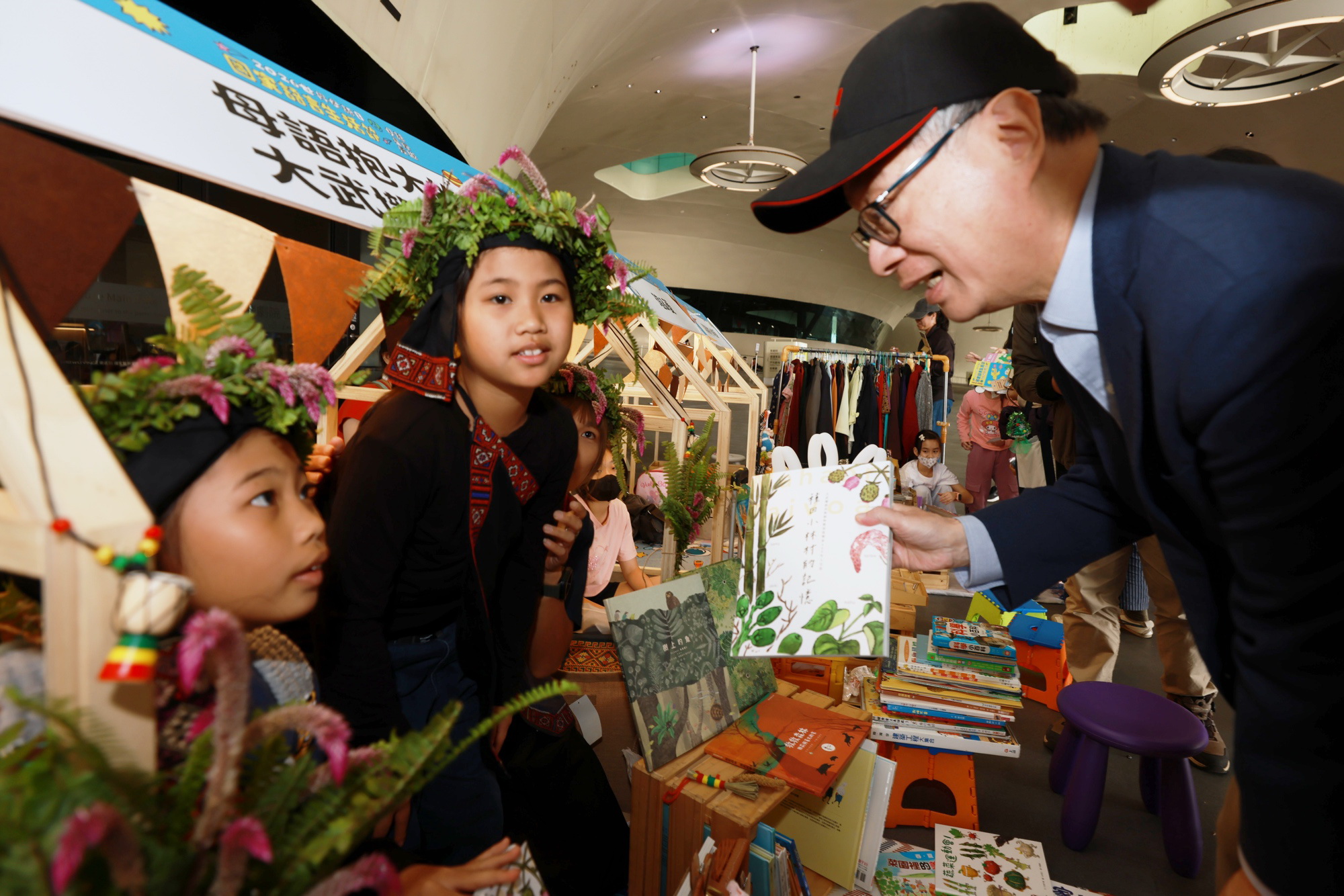 ( 文化部長李遠(右)參觀以小朋友為主角的「小老闆市集」攤位,聽原住民族小老闆分享故事 圖/文化部提供 )