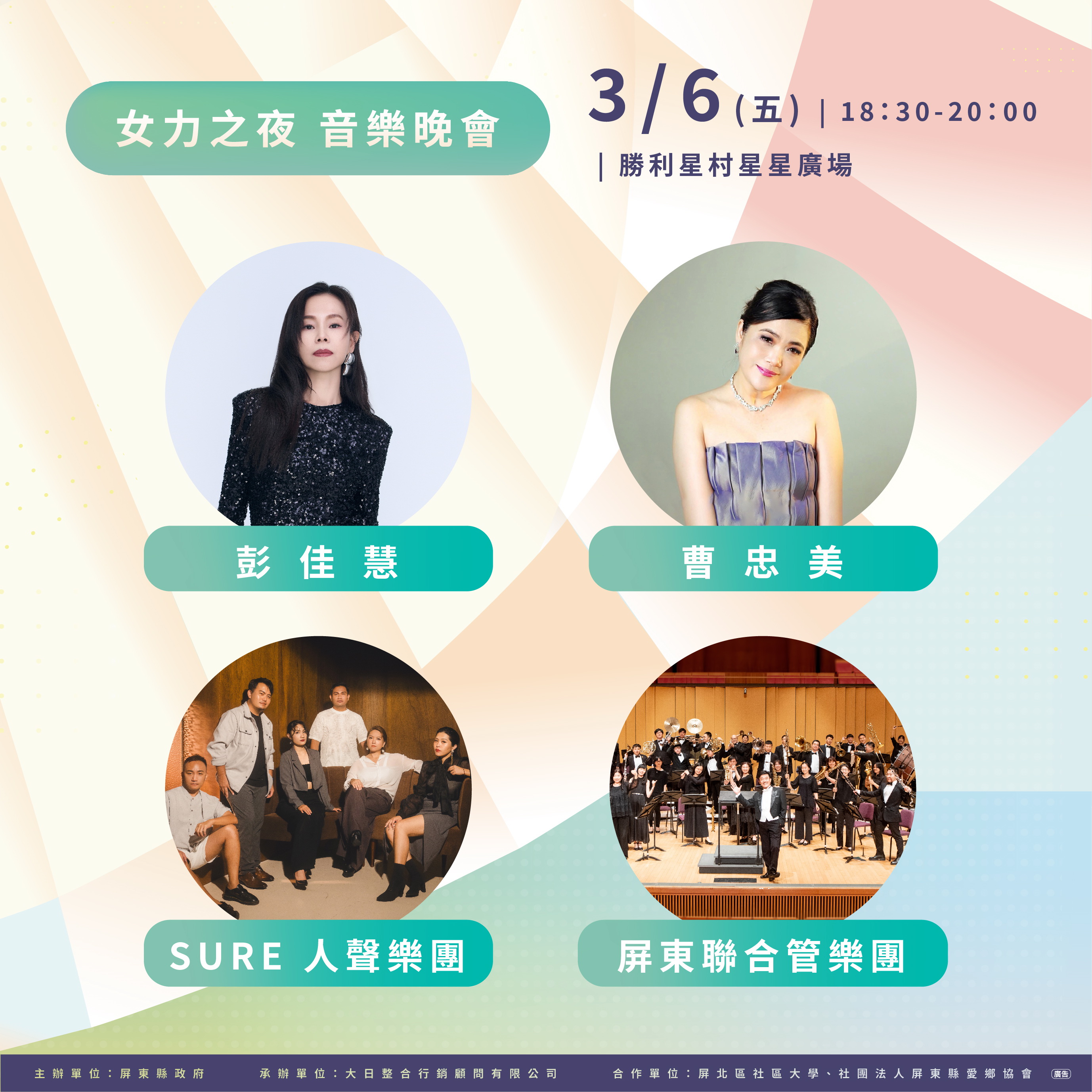 透過多元音樂風格交織,展現女性溫柔而堅定的力量,為系列活動注入豐沛情感與能量,本晚會免報名,歡迎民眾免費參加。