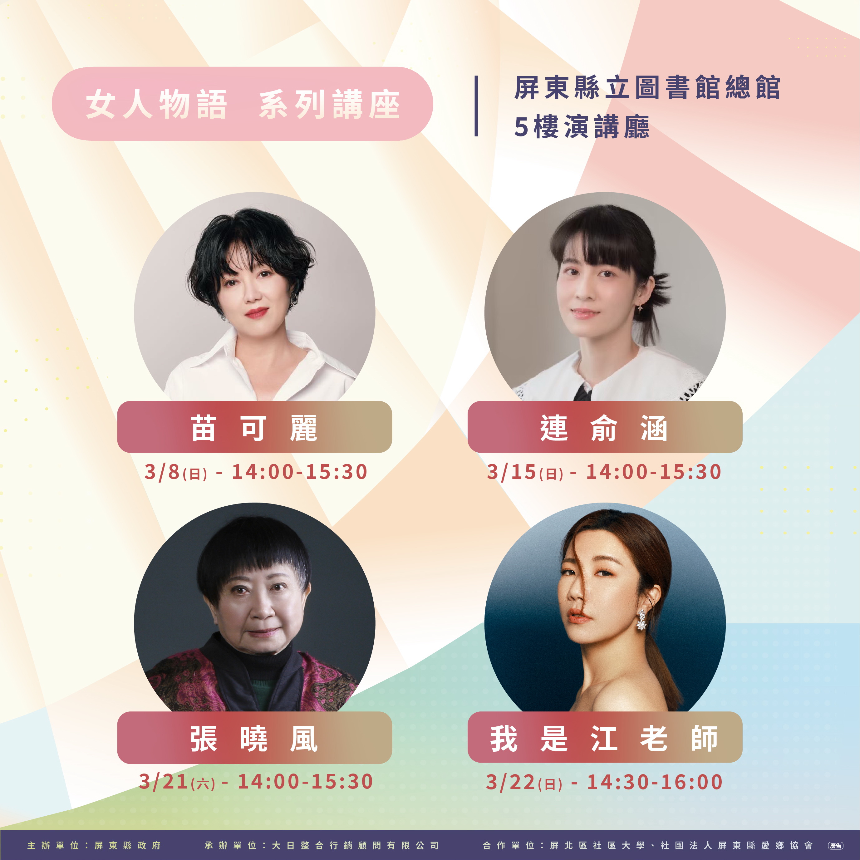 邀請不同領域女性分享生命歷程與專業經驗,活動地點皆於屏東縣立圖書館總館舉行。