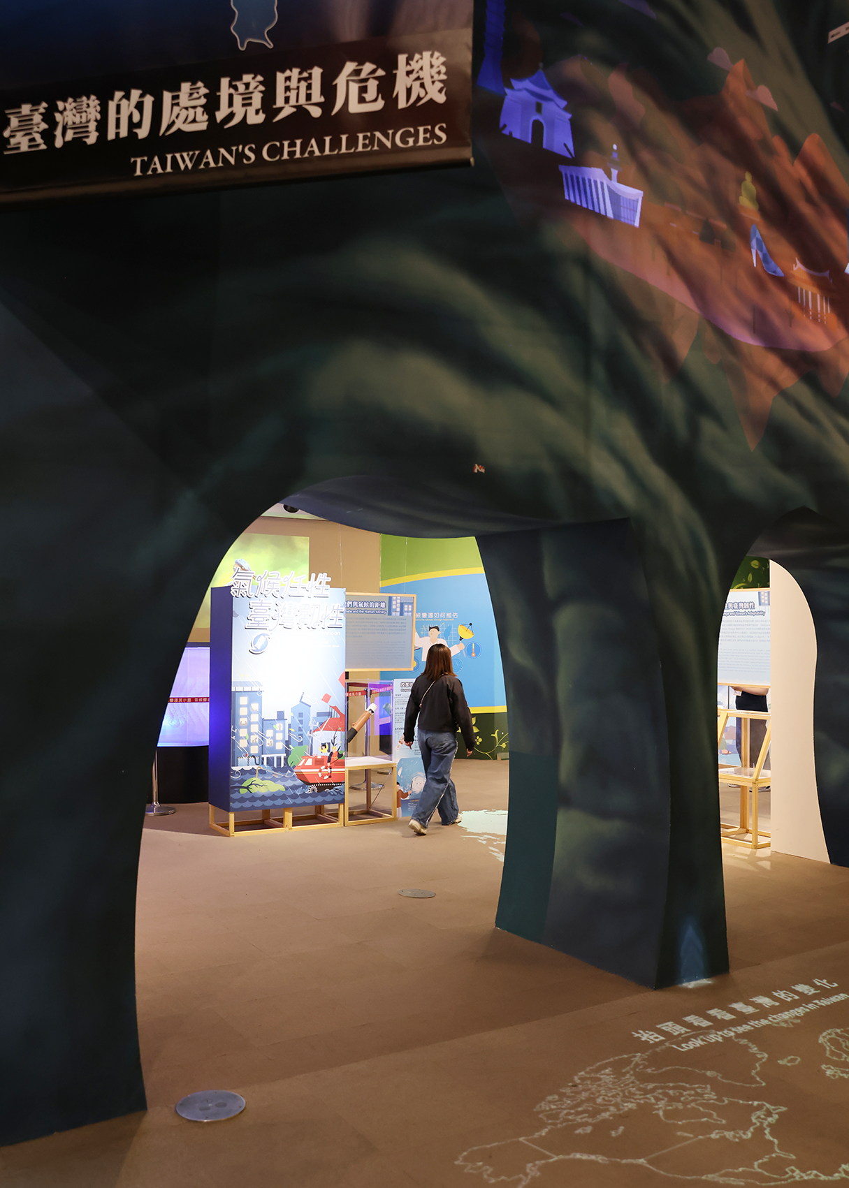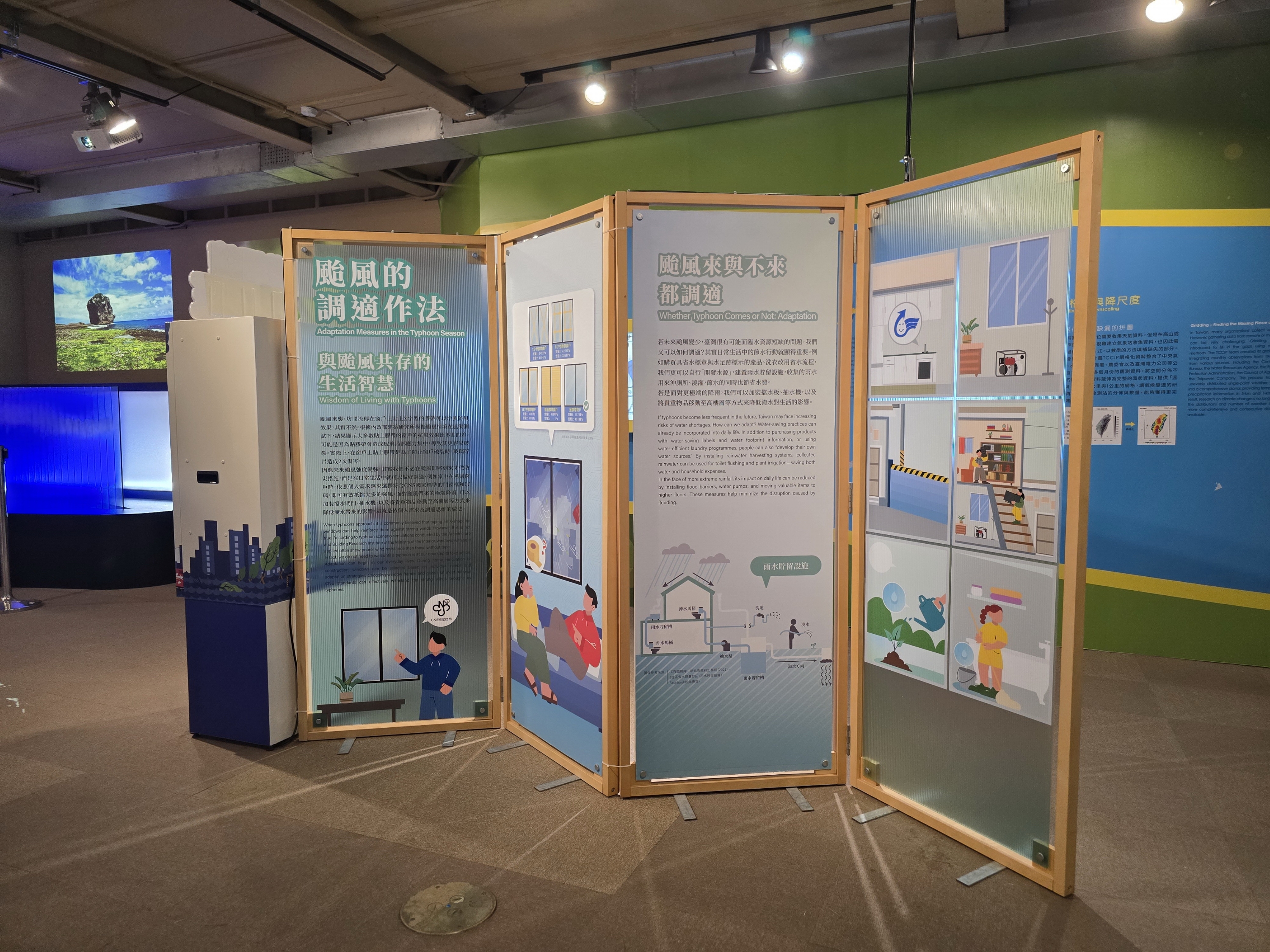 展示內容涵括三個面向,有「與氣候共存」、從過去到未來推估的「颱風的時光迴廊」,以及因應颱風來與不來的「調適與策略」。