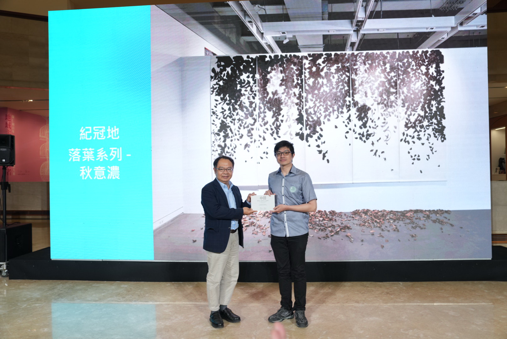 ( 何創時書法藝術基金會吳國豪主任(左)頒發何創時書法篆刻類特別獎予紀冠地(右) 圖/高美館提供 )