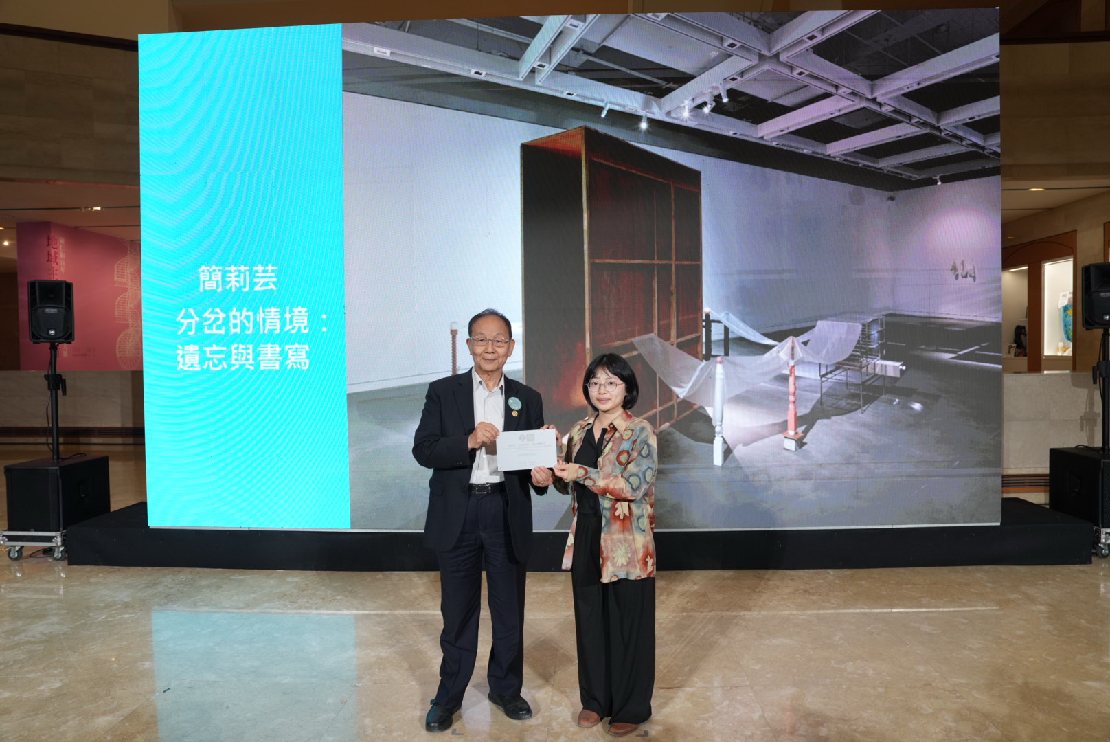 ( 聚和國際董事長郭聰田(左)頒發聚和國際環境永續特別獎予簡莉芸(右) 圖/高美館提供 )