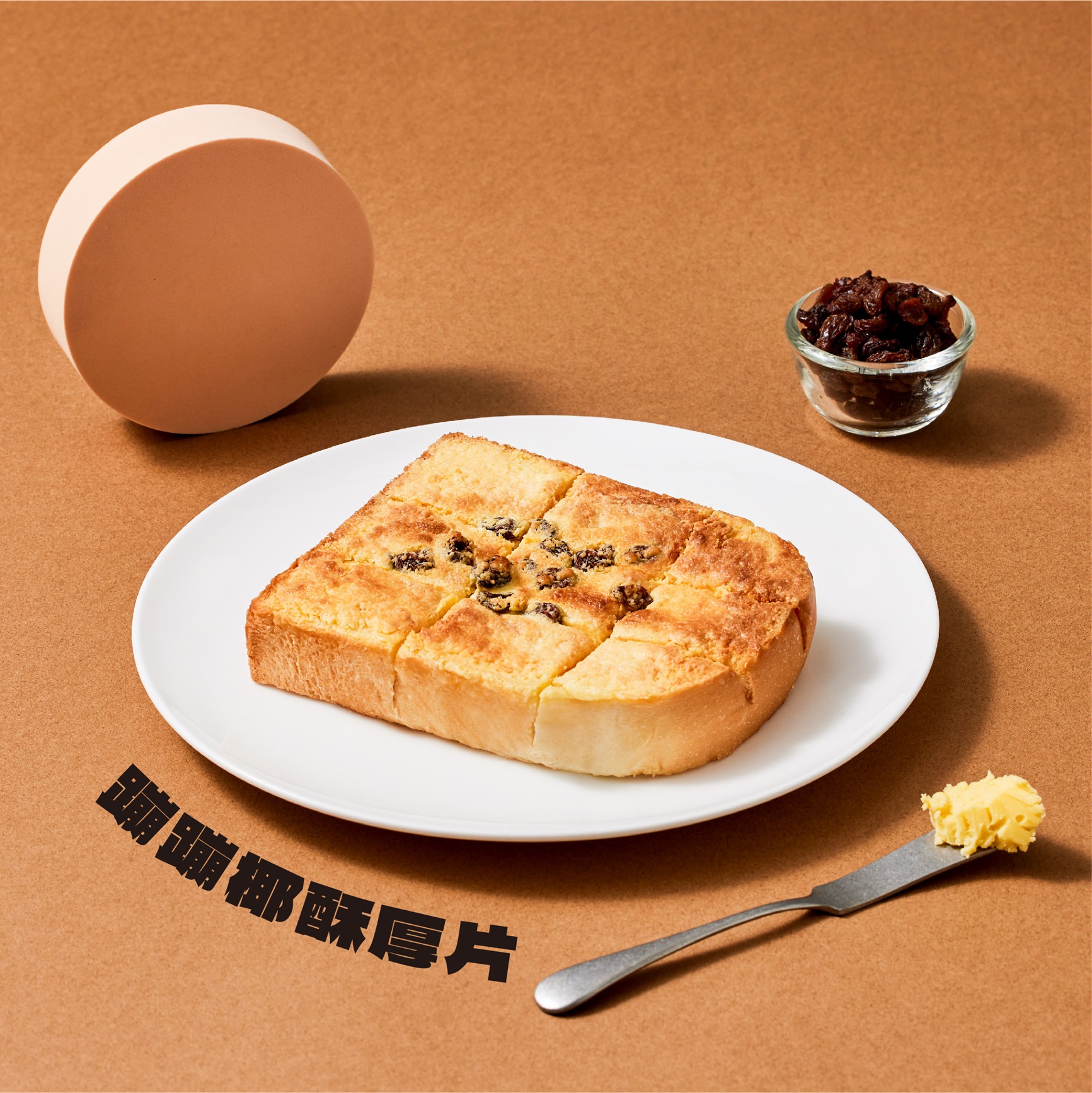 金黃椰酥搭配葡萄果乾,輕輕塗在鮮奶厚片上,外酥內軟的口感,還有椰子和葡萄乾的香氣,絕對是下午茶的Party必備小點心!