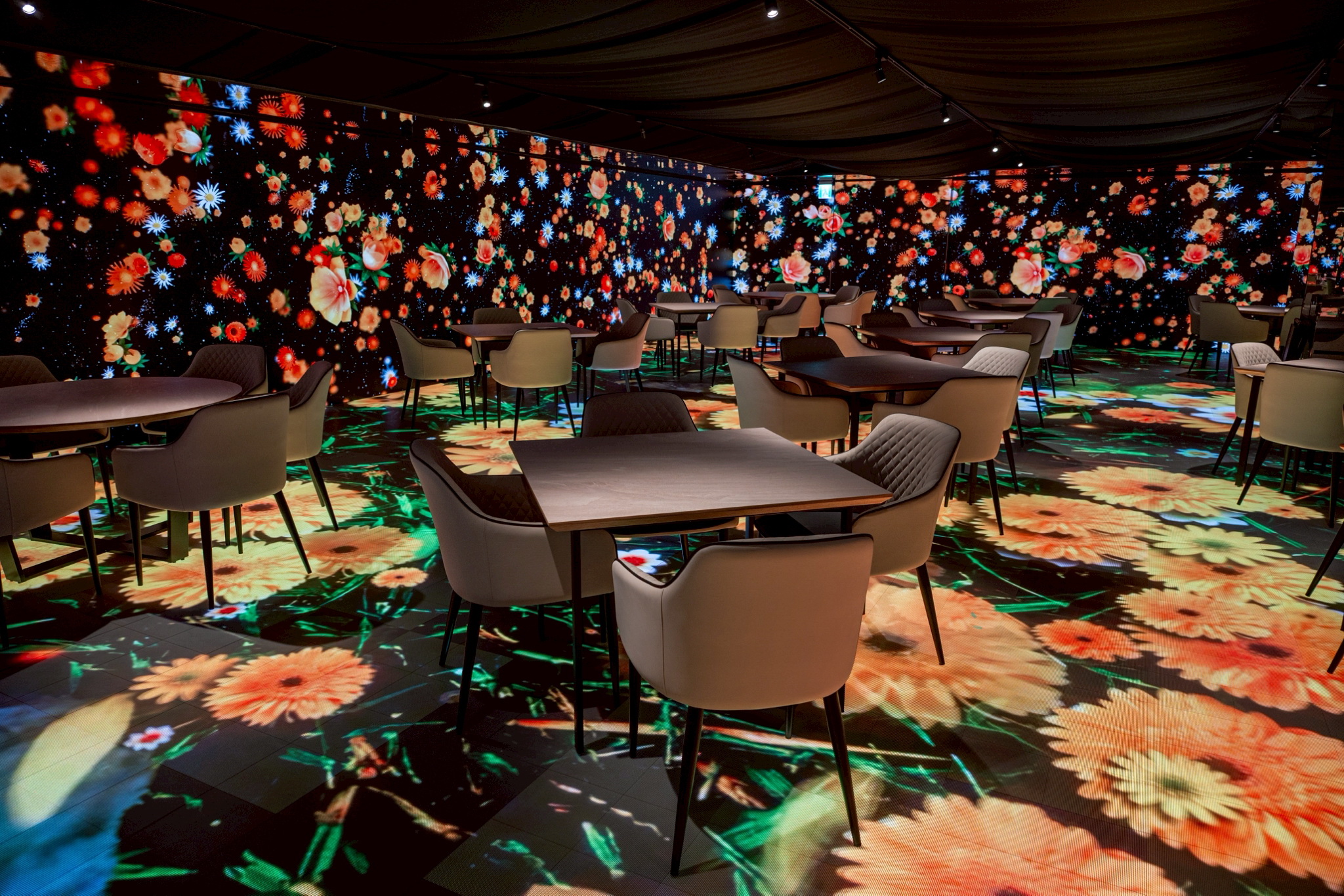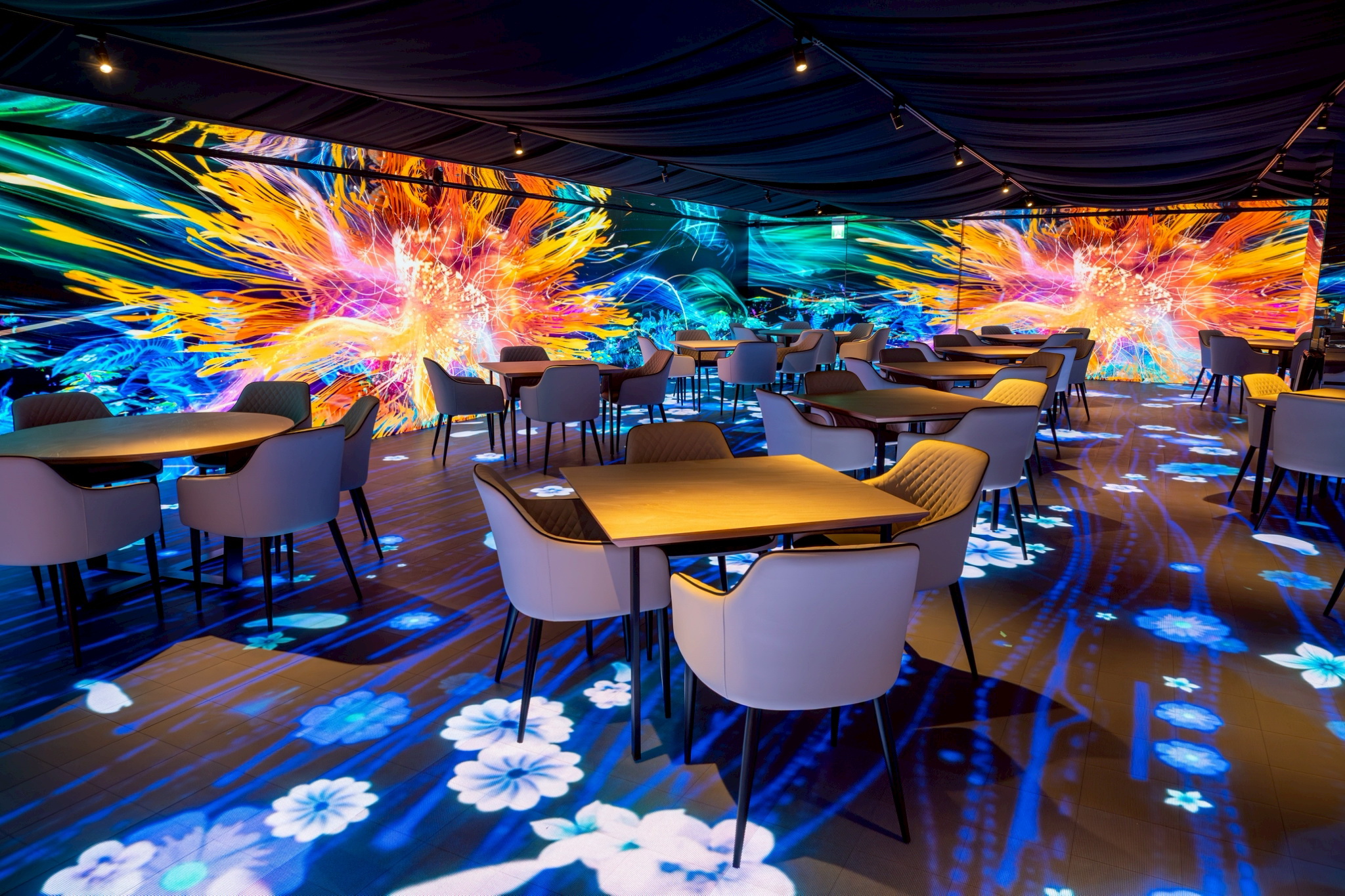 影像隨料理節奏切換,帶領賓客踏入夢幻花境、穿越羚羊峽谷的光影縫隙、遨遊浩瀚星海,甚至潛入海底與鯨魚共舞,實現虛實交錯的劇場級饗宴。