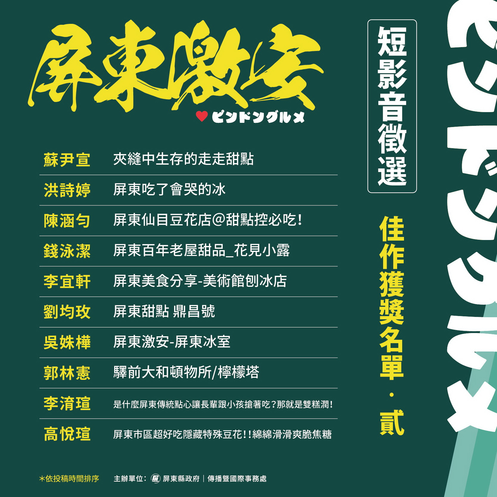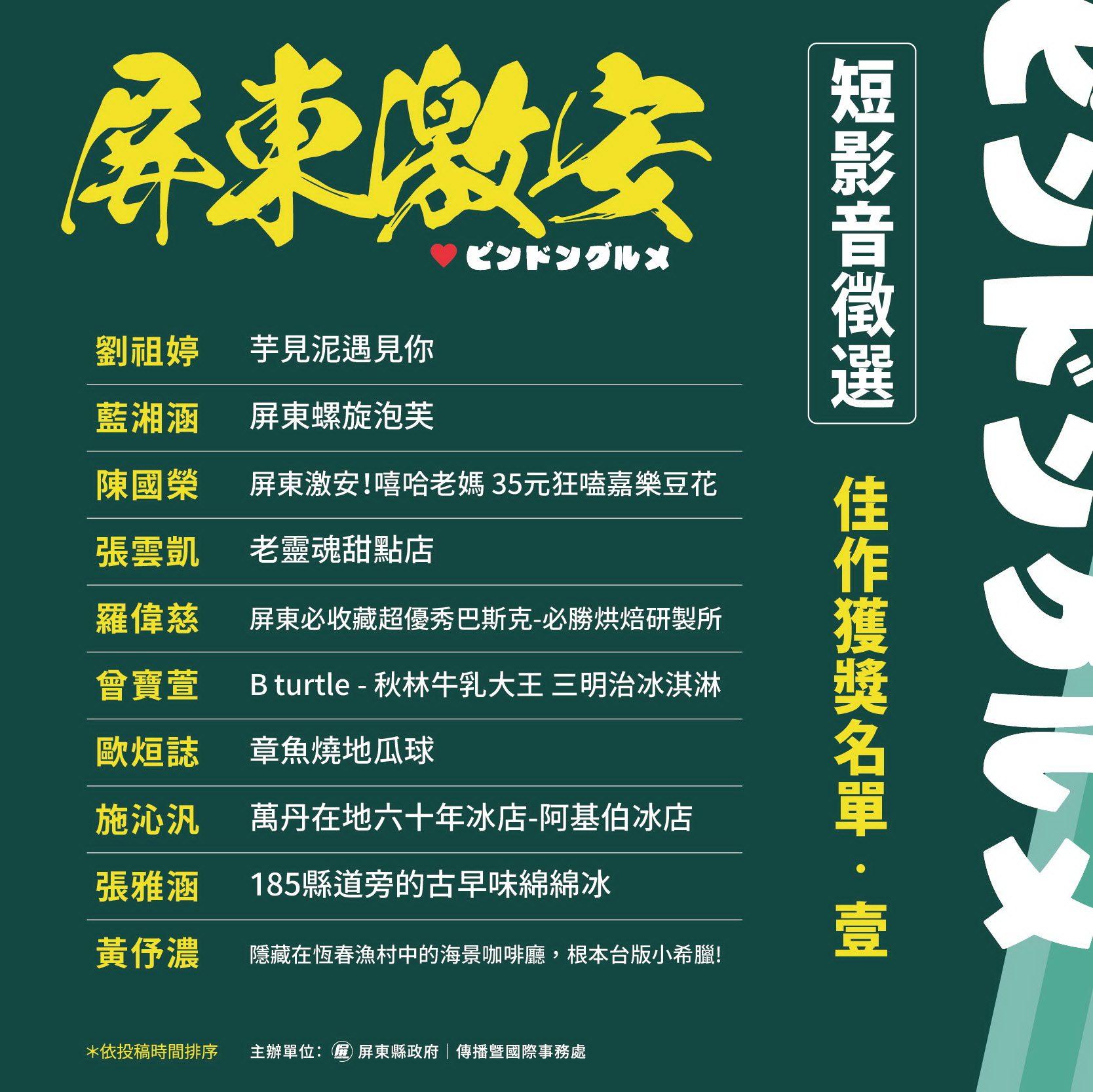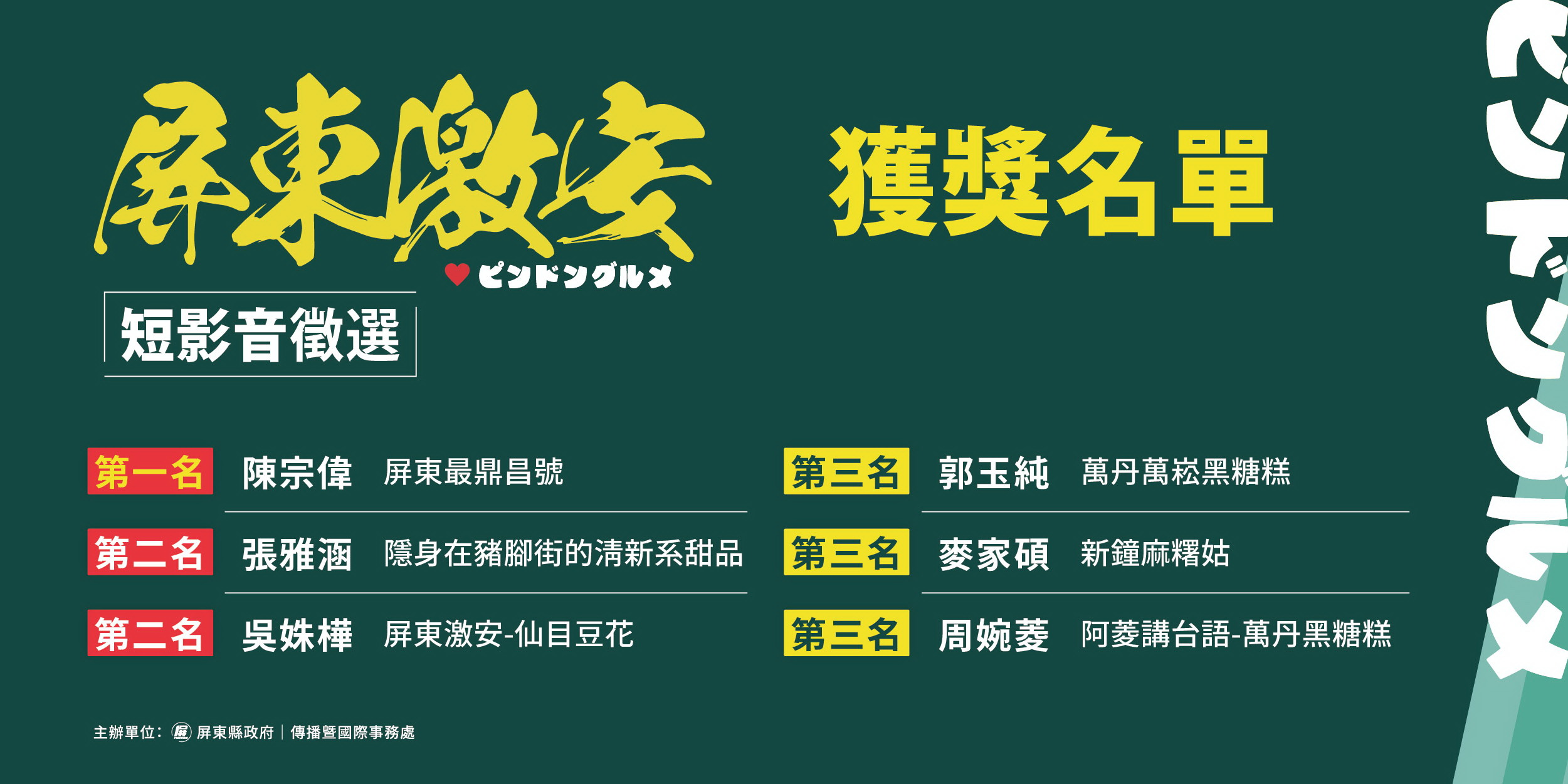 由屏東縣政府主辦的 「屏東激安」美食短影音競賽,9月15日正式公布得獎名單。