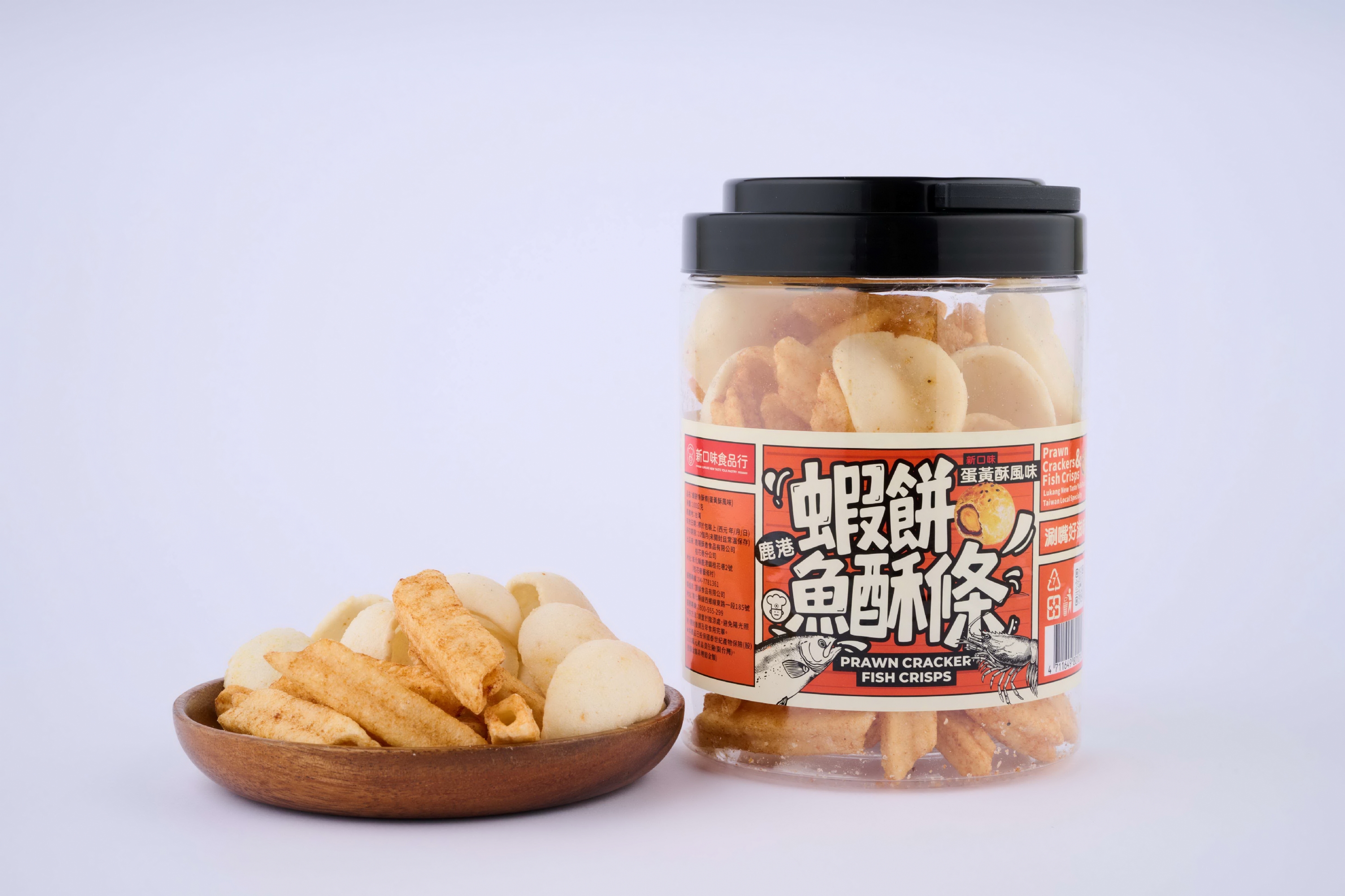 ( 熱賣款零嘴「蛋黃酥風味蝦餅魚酥條」(200元罐) 圖/新口味食品行提供 )
