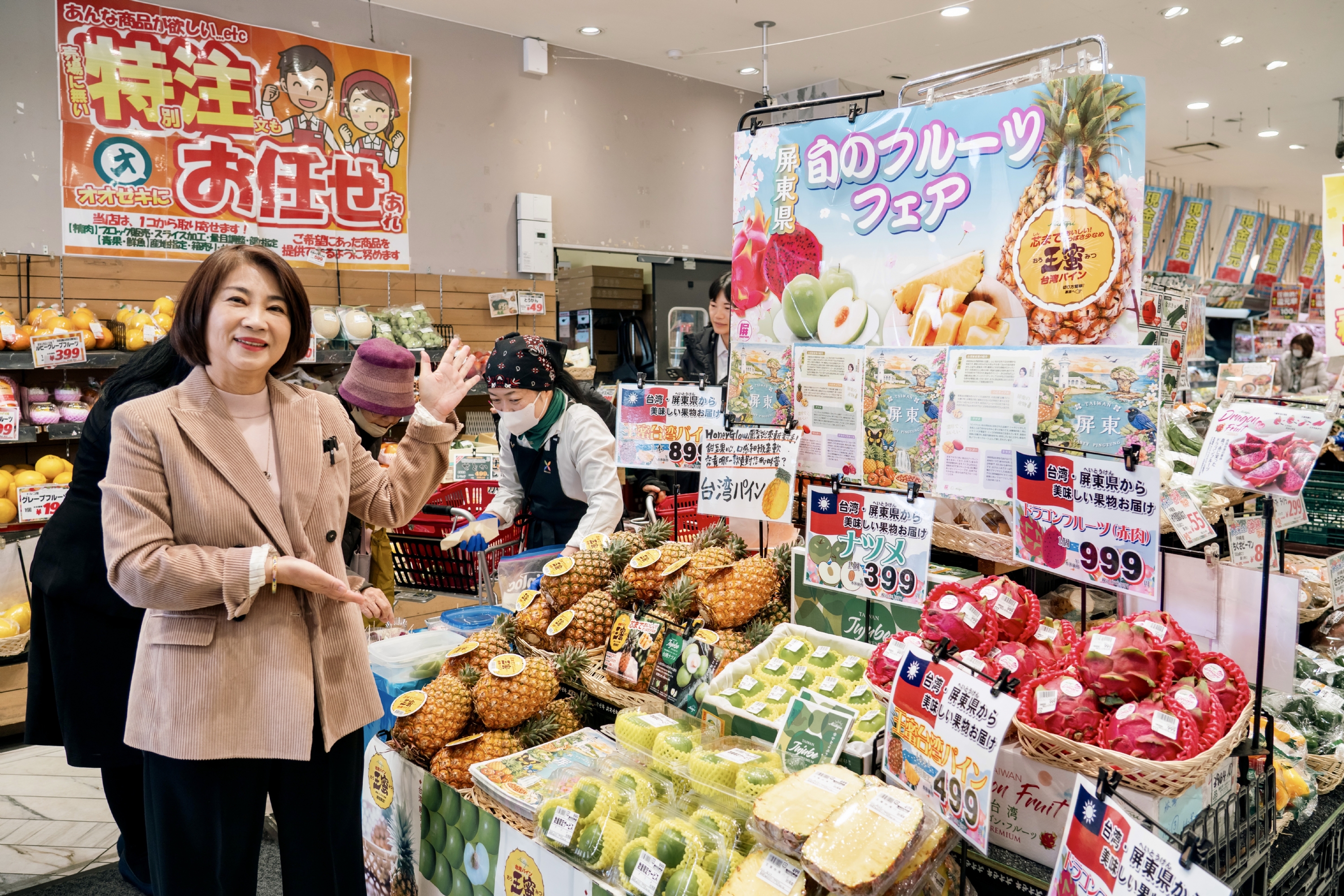 今年包括日本知名連鎖大關超市(Ozeki)首次引進屏東精品蜜棗、「王蜜」鳳梨及火龍果上架銷售。