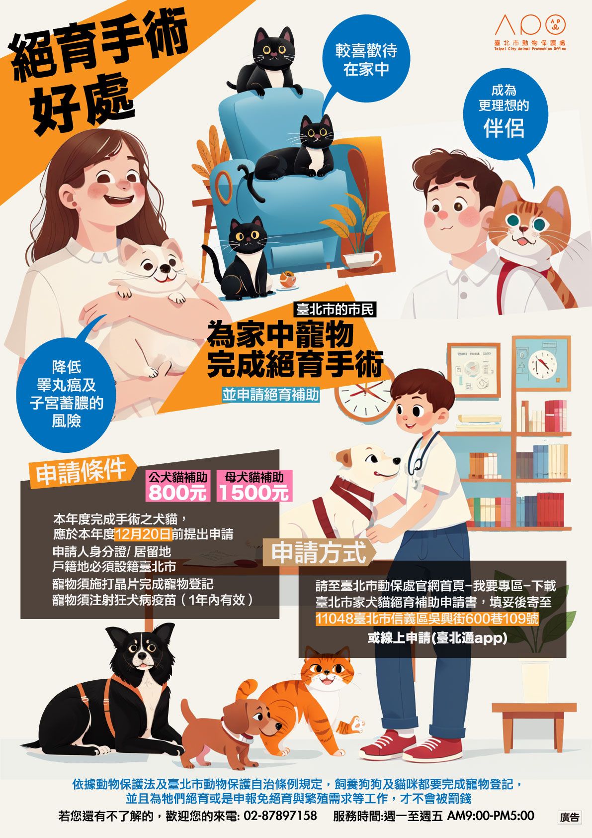 動保處提醒飼主,臺北市的家犬貓絕育補助採「先手術,後補助」的方式辦理。