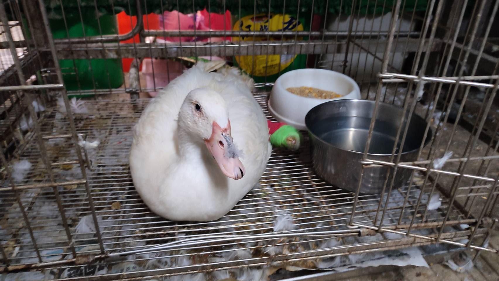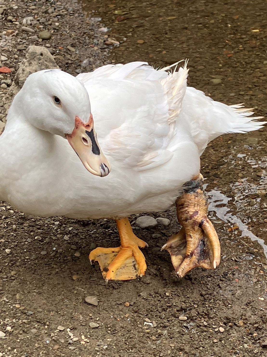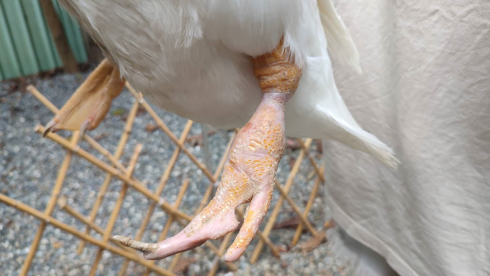 這隻白鴨的腳掌腫脹滲血,情況非常危急。