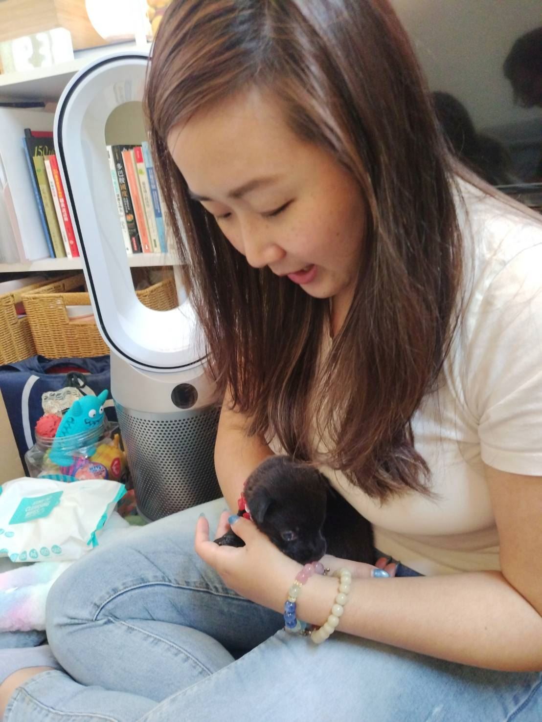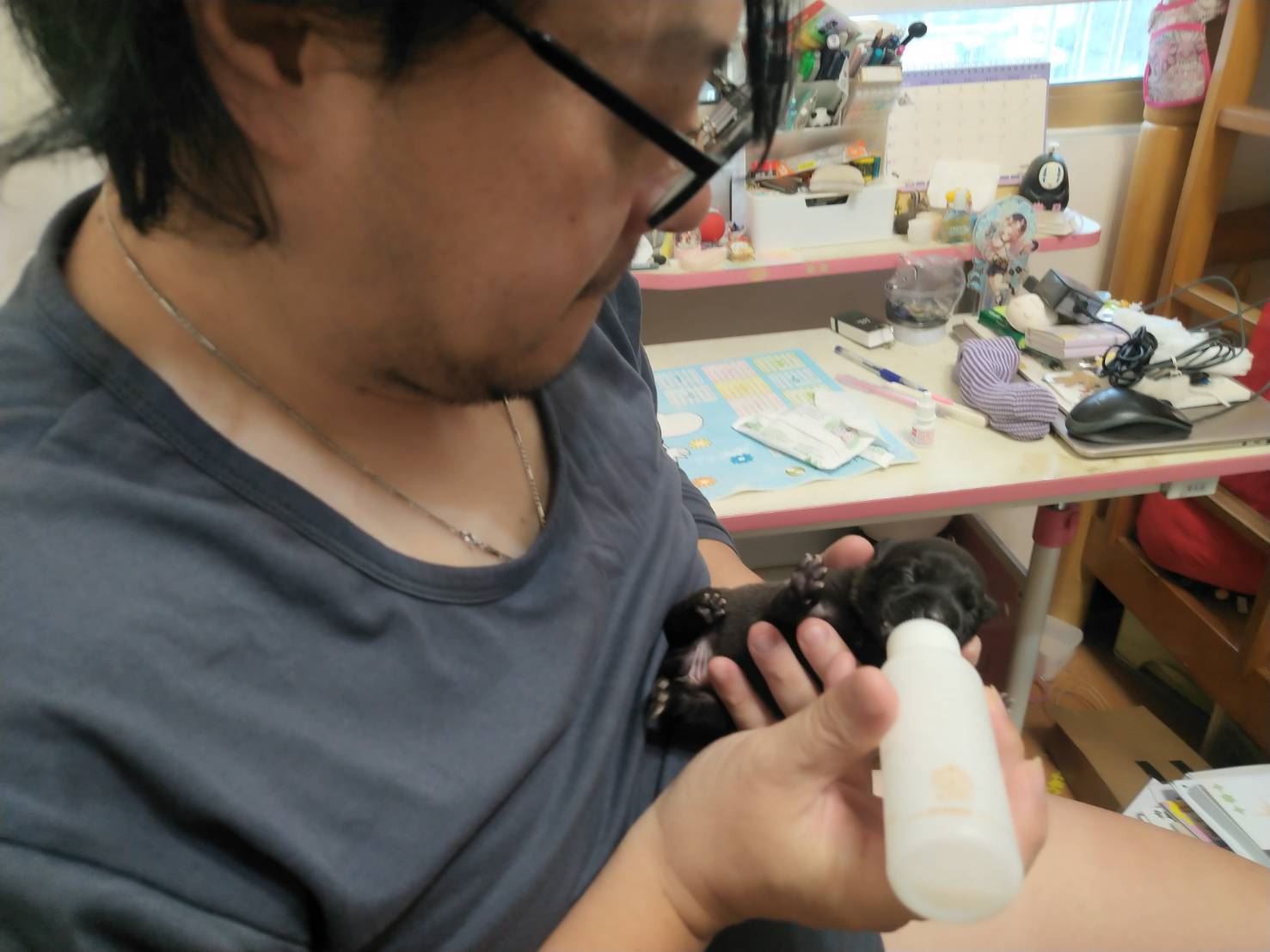 榮先生回憶起曾照護過的一隻兩週大的幼犬:「牠全身失溫且有感染跡象,剛開始由湯小姐帶回家照顧。