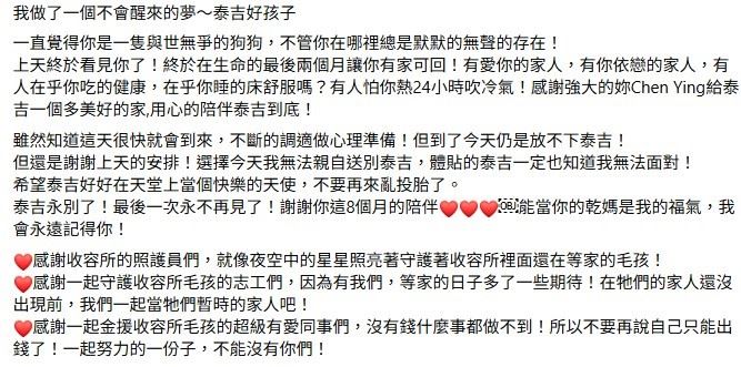 泰吉離世後,田美惠更寫下紀念文,感謝牠一路陪伴的溫情時光。