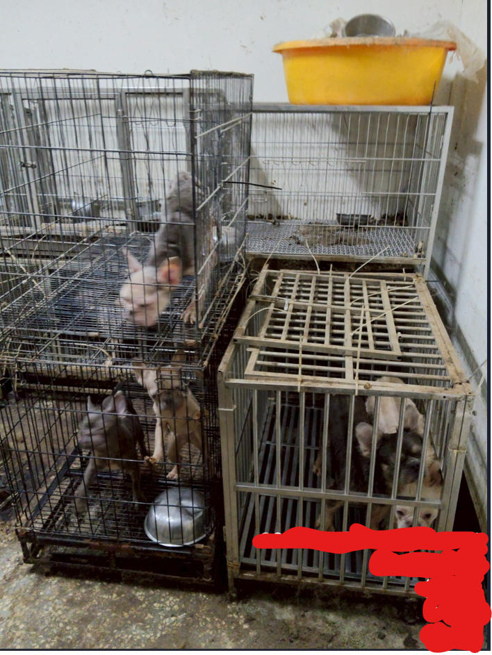 案發現場犬隻被關在狹小籠具、環境髒亂,導致多數犬隻罹患角膜炎、嚴重脫毛,甚至有臀側壓瘡。