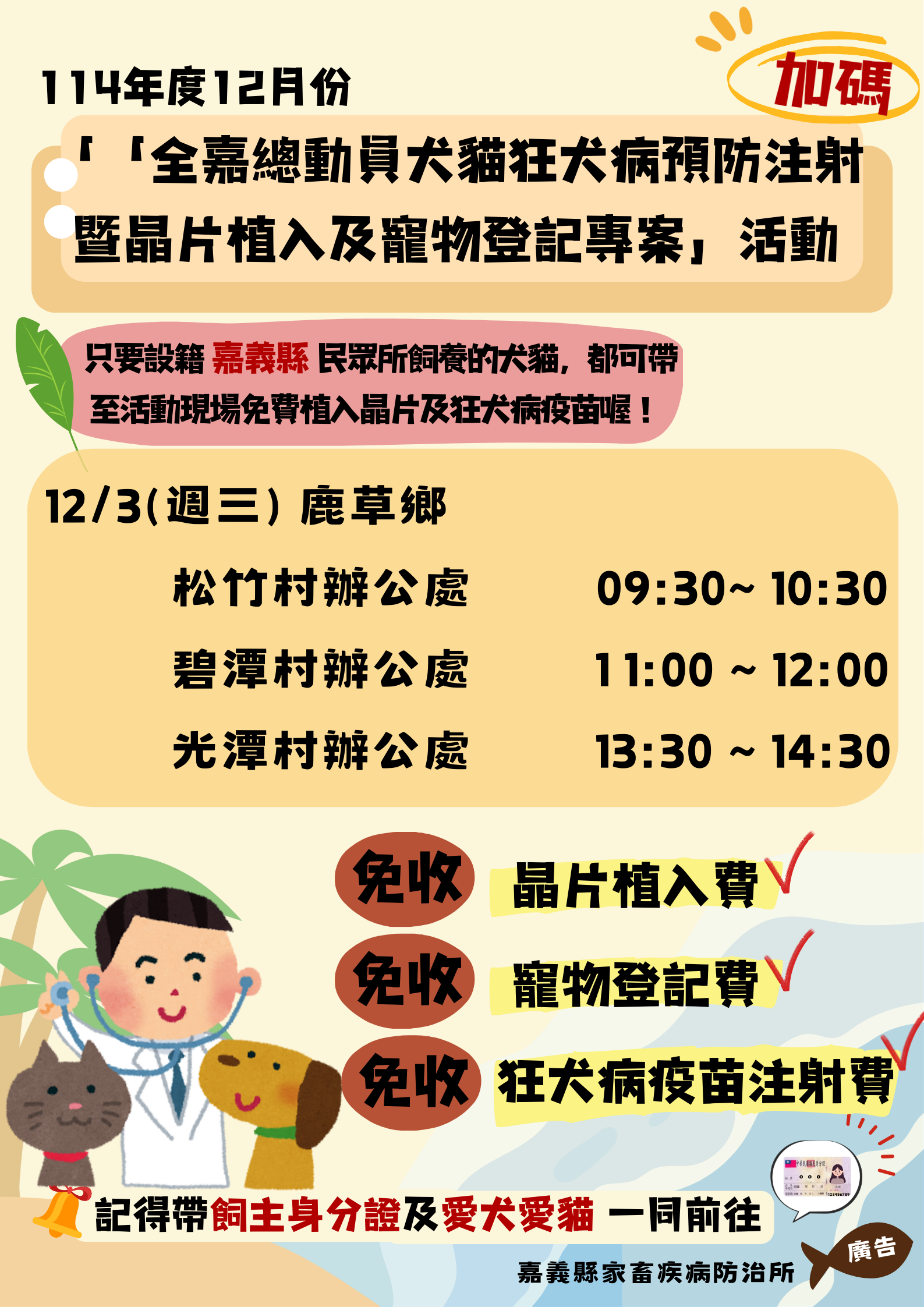 嘉義縣12月份的「全嘉總動員犬貓狂犬病預防注射暨晶片植入及寵物登記專案」正式啟動啦!