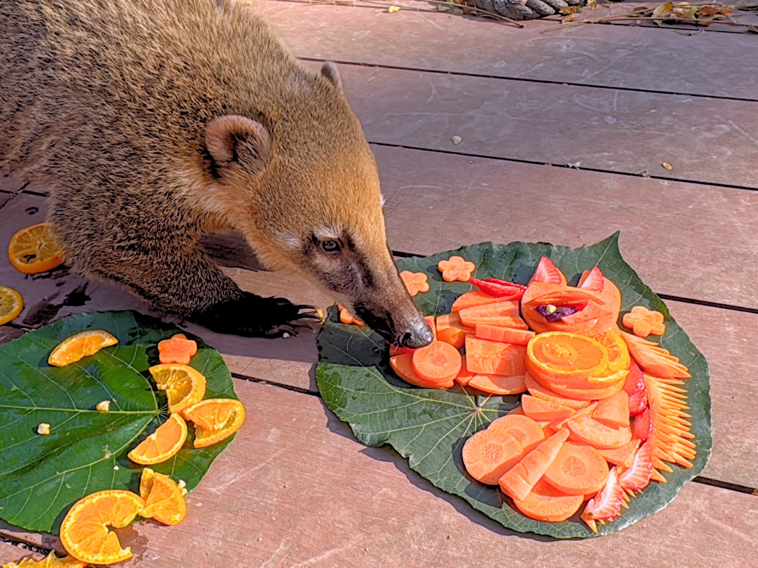 ( 長鼻浣熊品嚐特製金馬蔬果拼盤 圖/高雄市觀光局提供 )