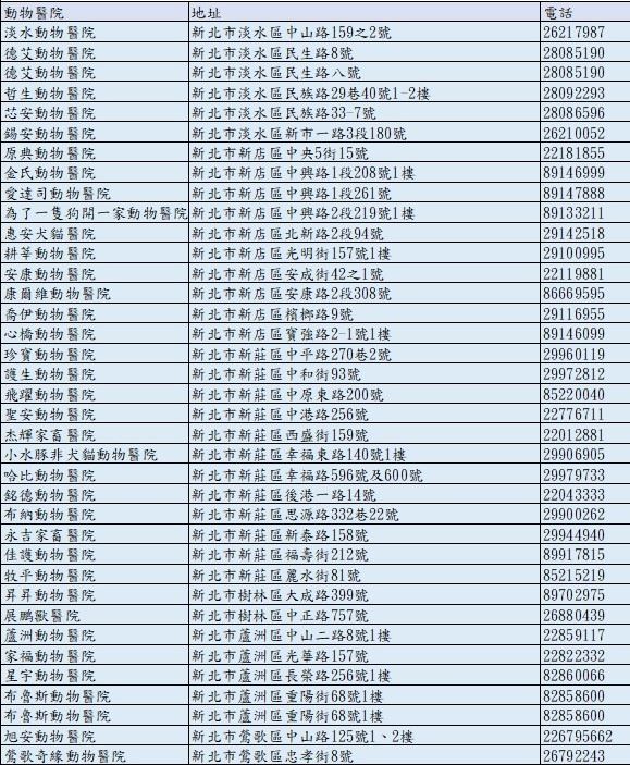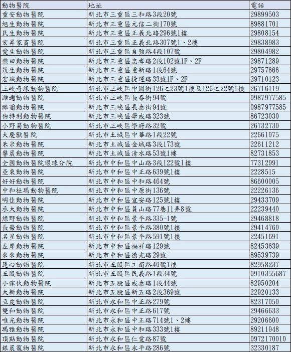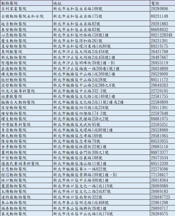 新北市動保處官網(醫院名單與營業資訊):https://www.ahiqo.ntpc.gov.tw/#/Post/91943