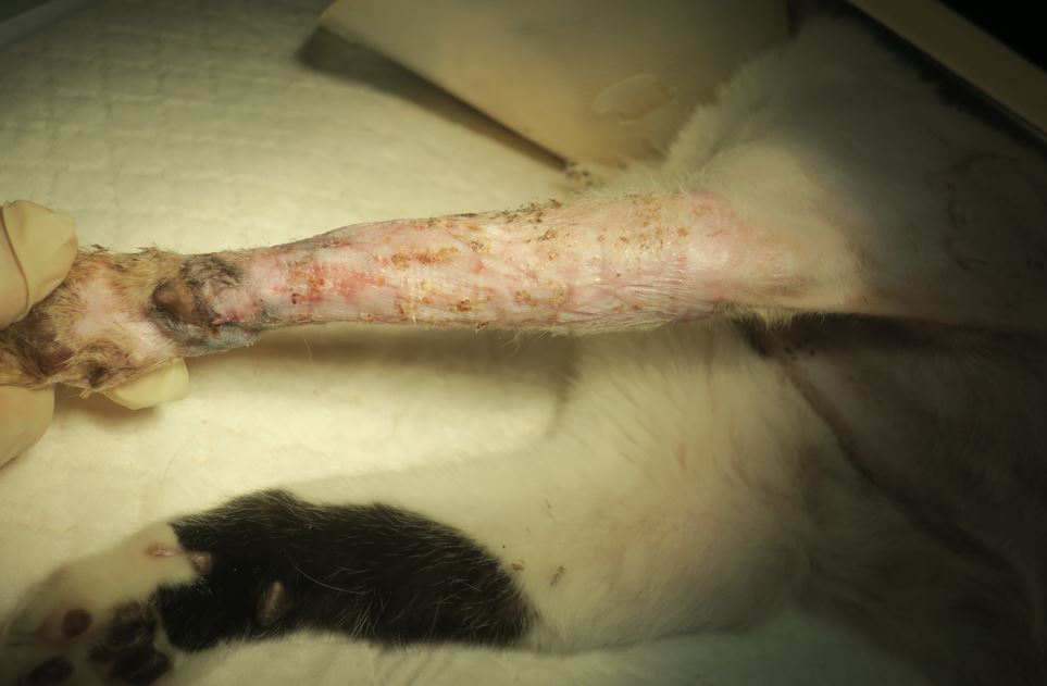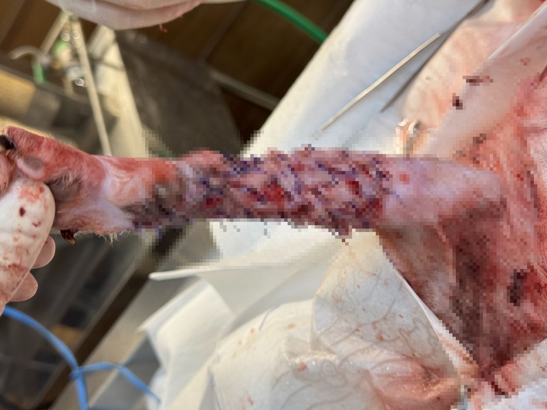 左前腳已有大範圍皮膚缺損,傷口深且面積廣,屬於癒合困難的複雜創傷。