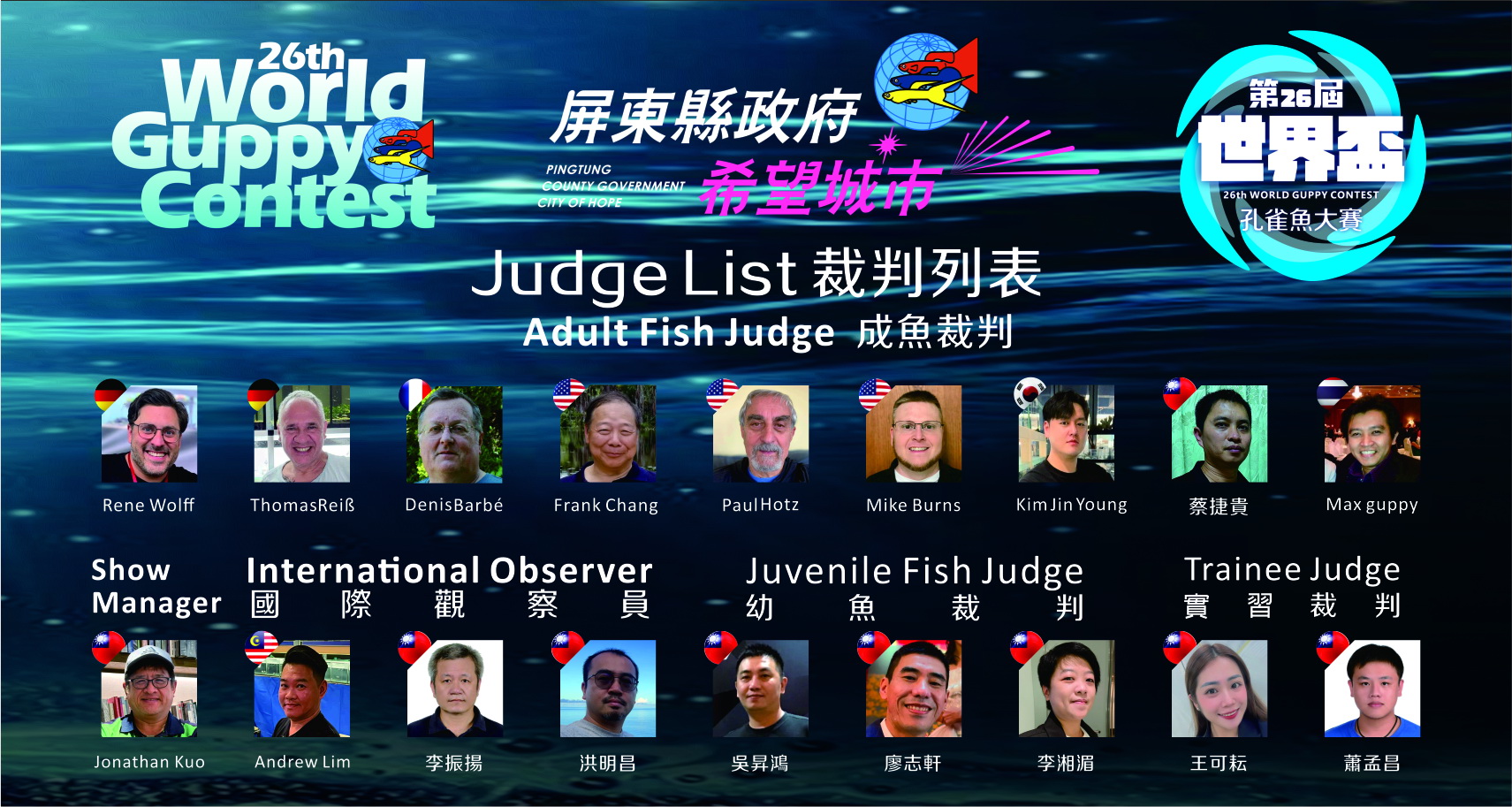 展現臺灣孔雀魚觀賞與育種領域的高度專業與國際影響力,本次賽事邀請多位國內外具國際經驗的專業評審共同進行評分。