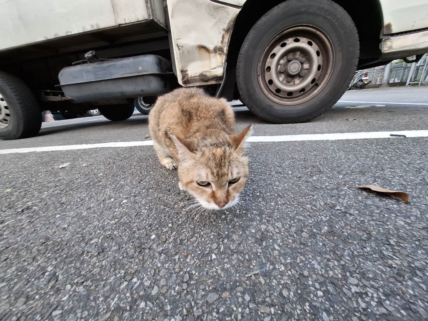 一隻瘦弱的浪貓獨自坐在巷內車道中央,四周車輛來往頻繁,情況十分危險。