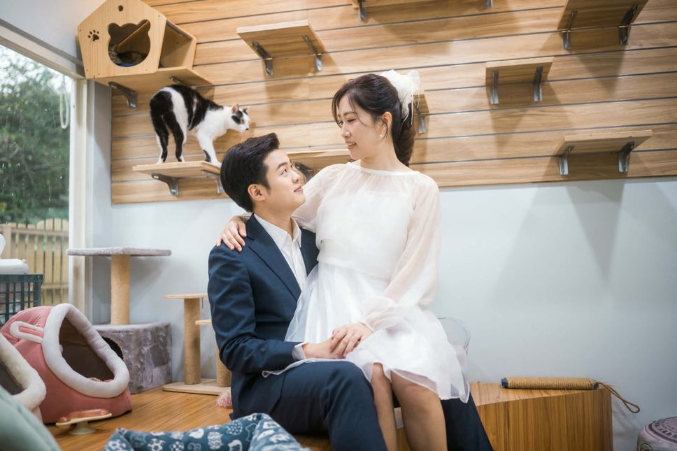 拍攝當天,新人走進新北市中和動物之家,與園區內的犬貓自然互動,現場氣氛輕鬆又溫馨。