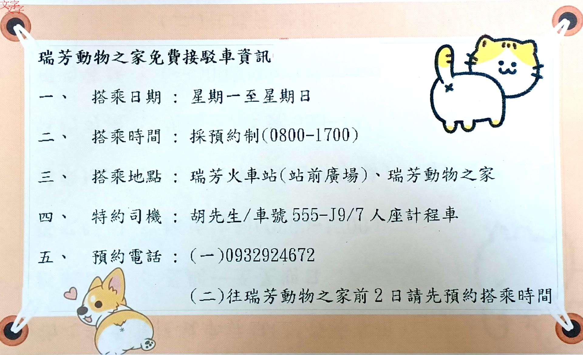 為改善這項問題,動保處特別規劃免費接駁計程車,只要民眾提前兩天完成預約。