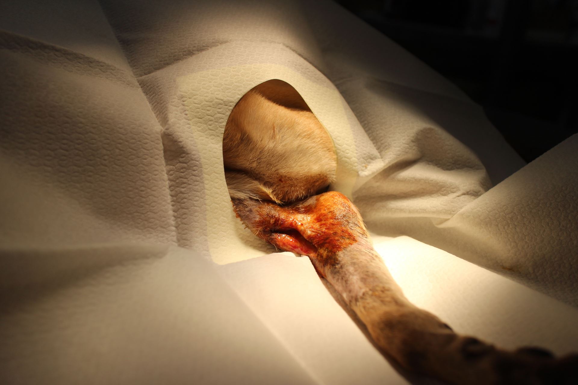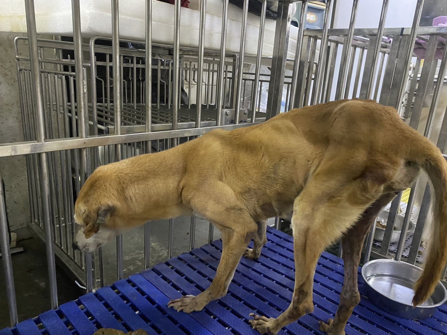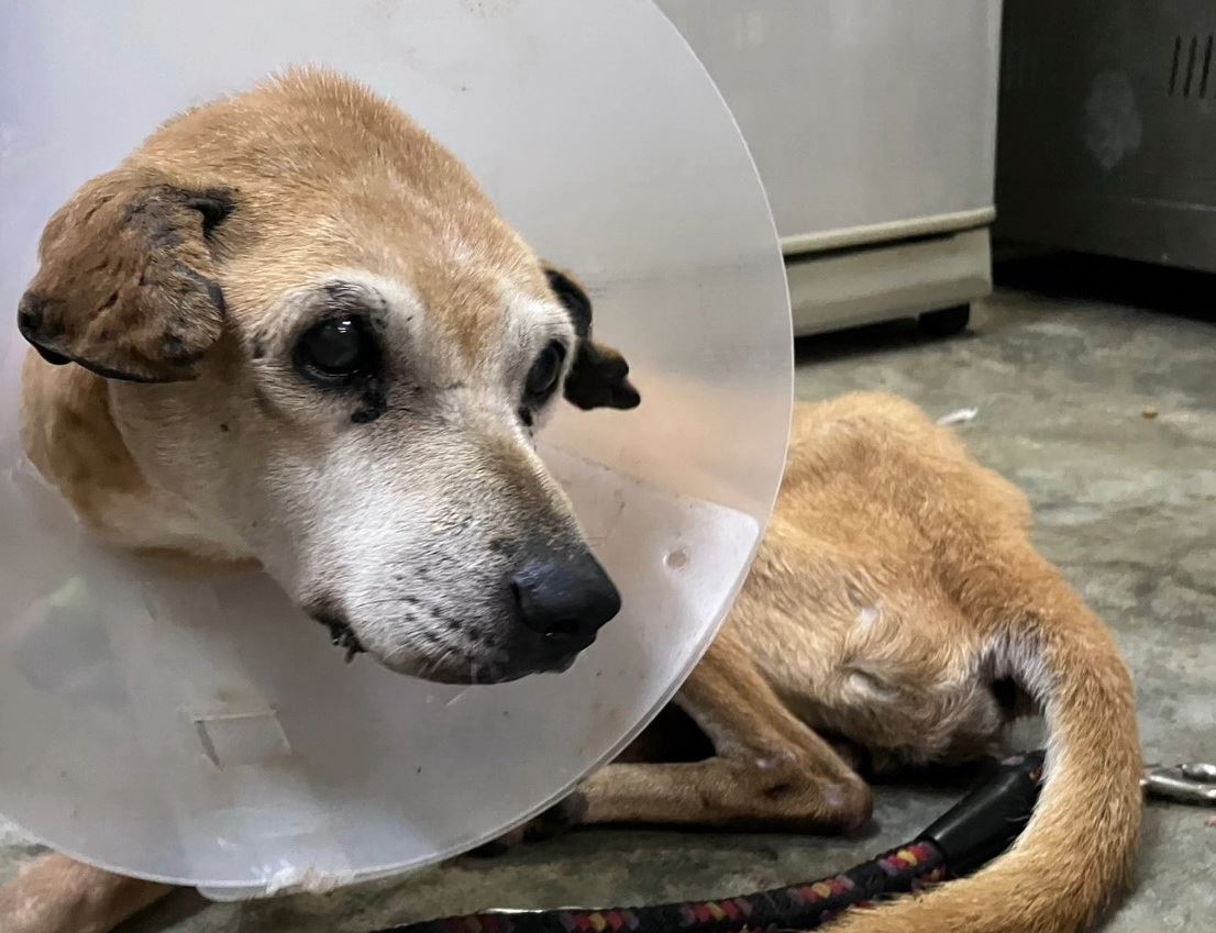 經獸醫師檢查後發現,老黃狗後肢無力,右前肢肘關節內側也有開放性傷口,情況需要立即處理。
