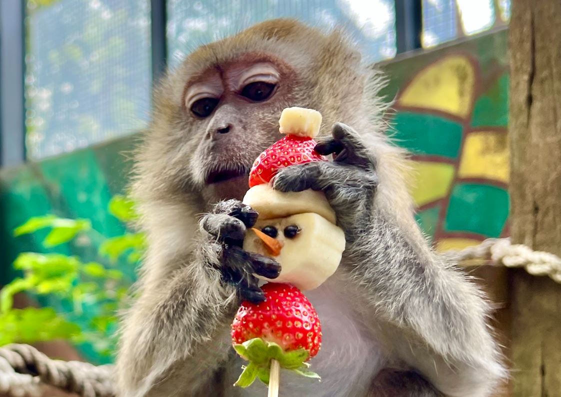 馬來猴首次品嘗草莓小雪人的酸甜滋味,逗趣的表情讓現場觀眾忍俊不禁。