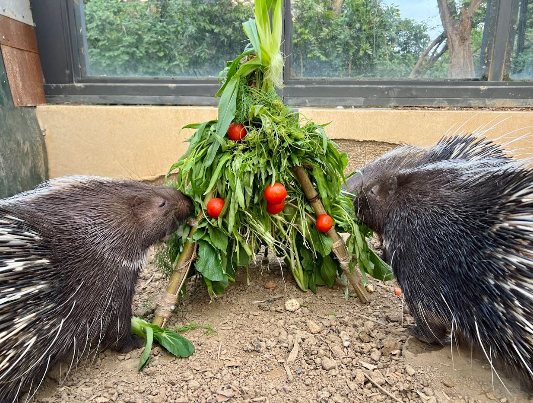 例如,以當季時蔬搭配聖女小番茄打造的小聖誕樹,讓冠豪豬們大快朵頤。