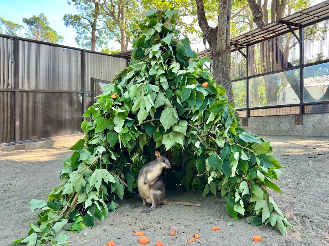 園方巧妙地將竹幹和枝條彎曲塑造成大型聖誕樹的骨架,並覆蓋上新鮮的構樹葉,為梅花鹿、波爾羊及沼林袋鼠準備了獨特的節慶大餐。
