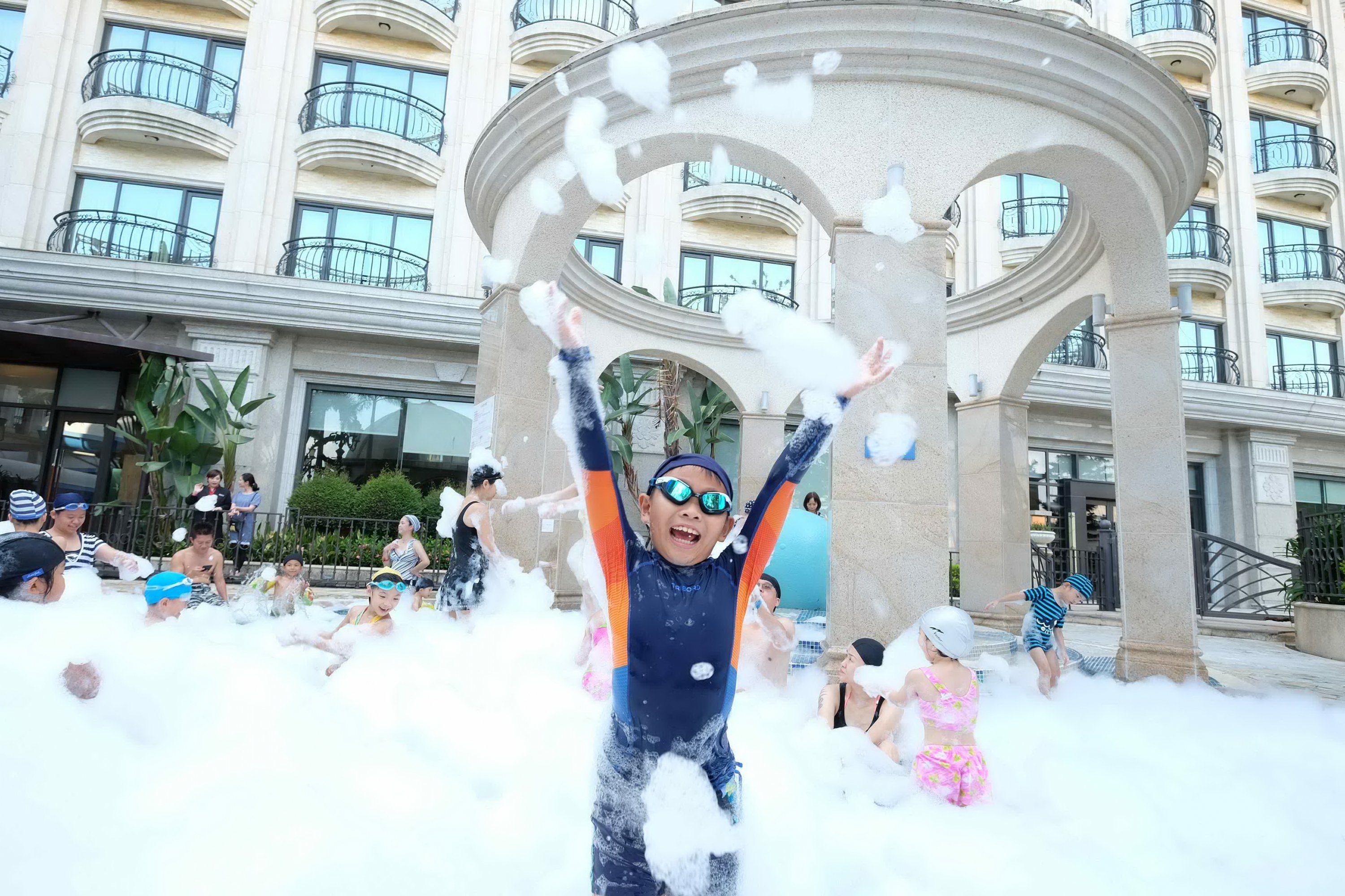 每日16:00至16:30,戶外戲水池畔的「泡泡趴派對」帶來沁涼消暑的夢幻體驗,讓大小朋友一同享受泡泡雨中的歡樂時光。