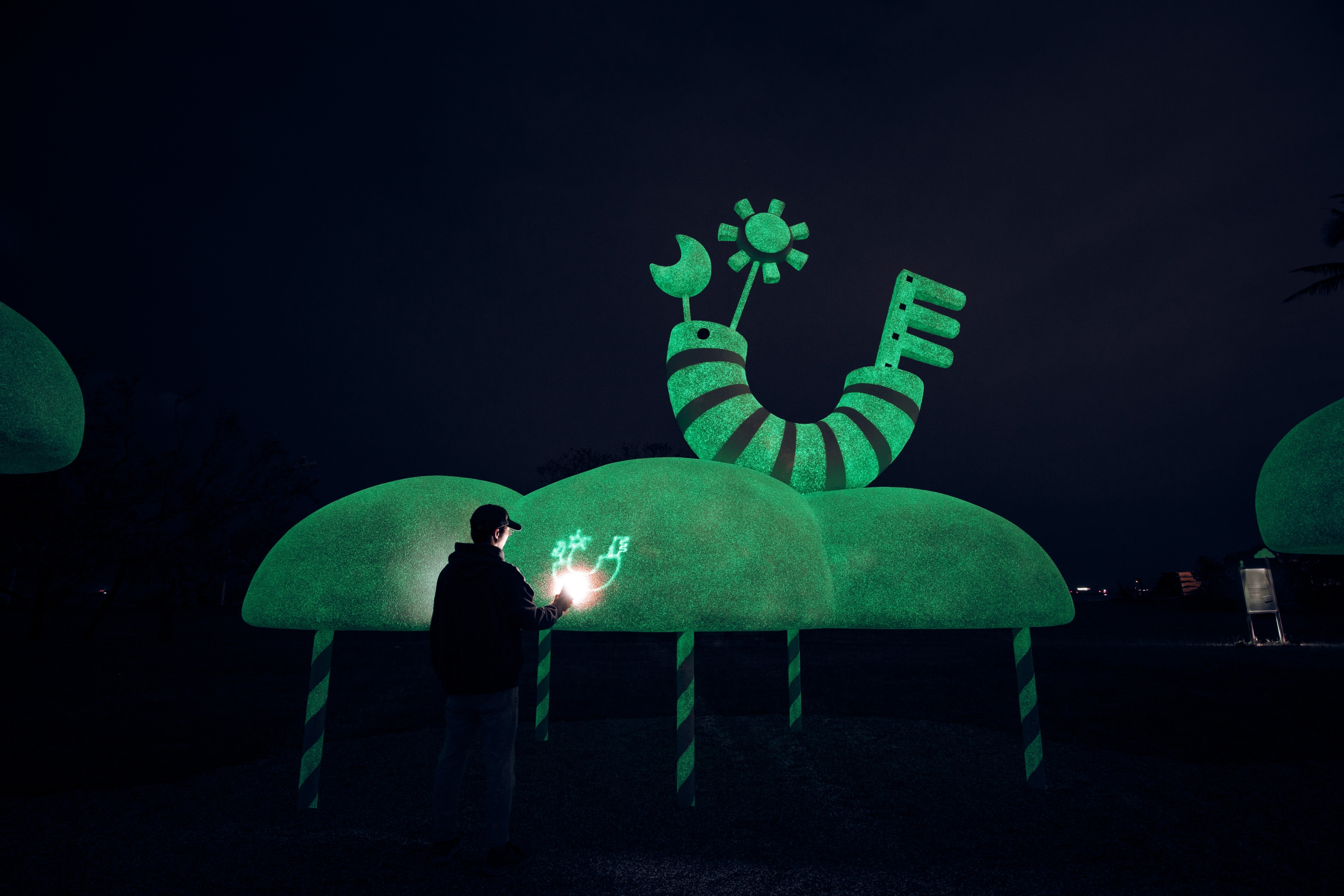 雕塑採用特別材質,白天吸收太陽能,夜晚便能發出柔和光芒,完美展現永續藝術的精神。