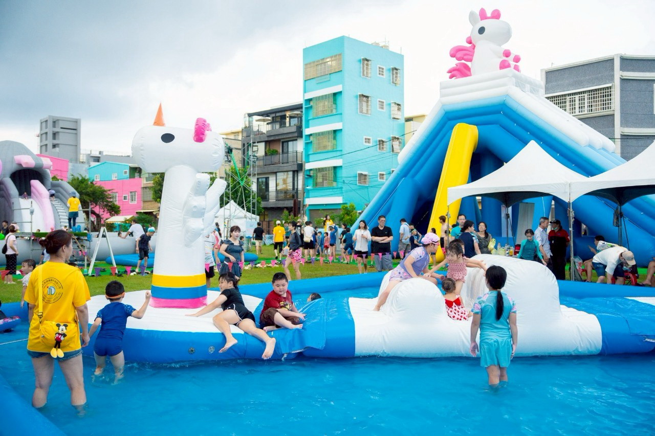 活動首週率先亮相的氣墊水樂園,也帶來嶄新的戲水設施,「斑馬闖關水跳床」等四座全新氣墊設施讓孩子們玩得不亦樂乎。