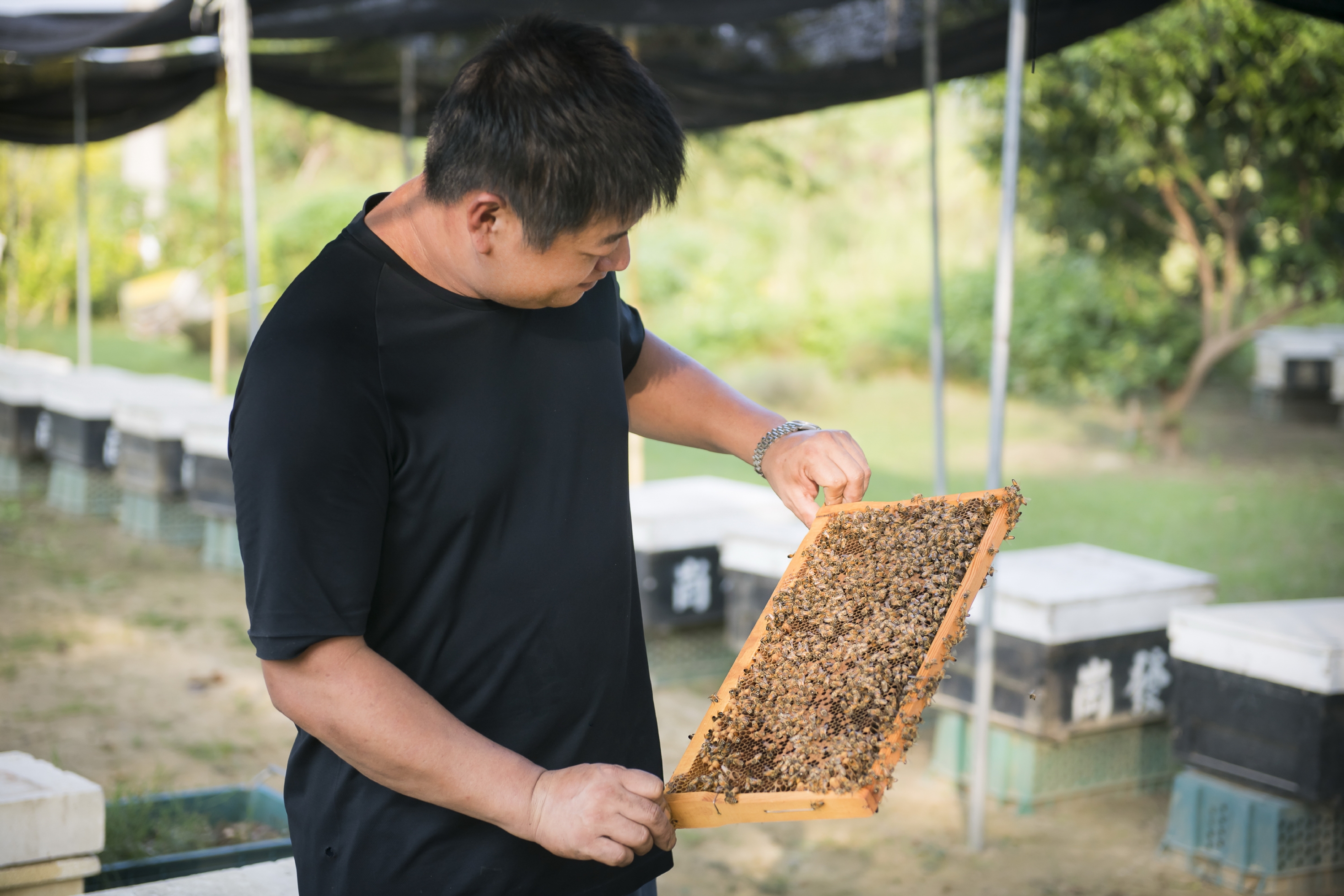 第二代蜂農王祈發,帶著蜂群追逐四季花期:春天採荔枝與龍眼蜜、夏天收百花蜜,並用心培育營養豐富的蜂王乳。