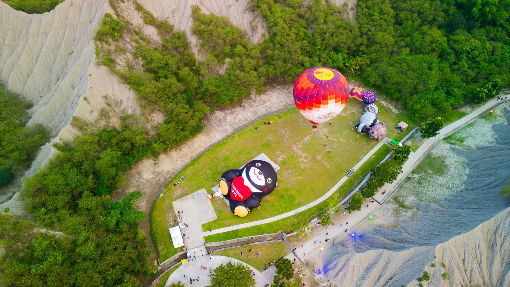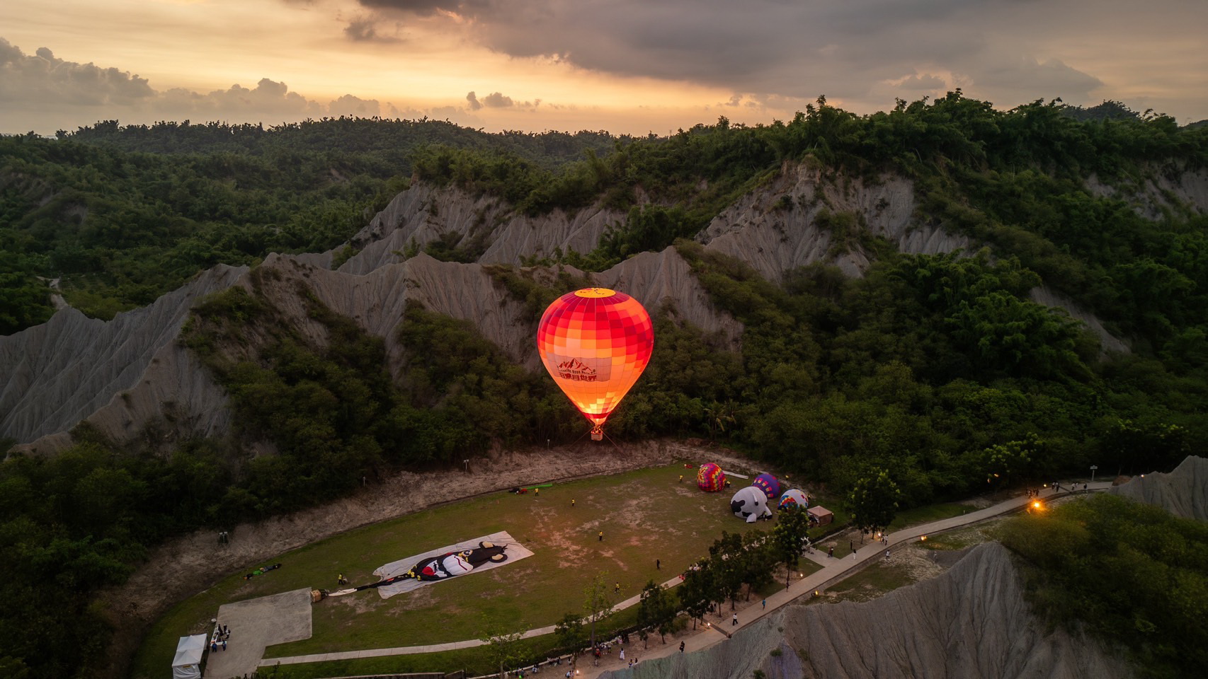 ( 月世界惡地山嶺,與熱氣球交織出夢幻景致 圖/高雄市觀光局提供 )