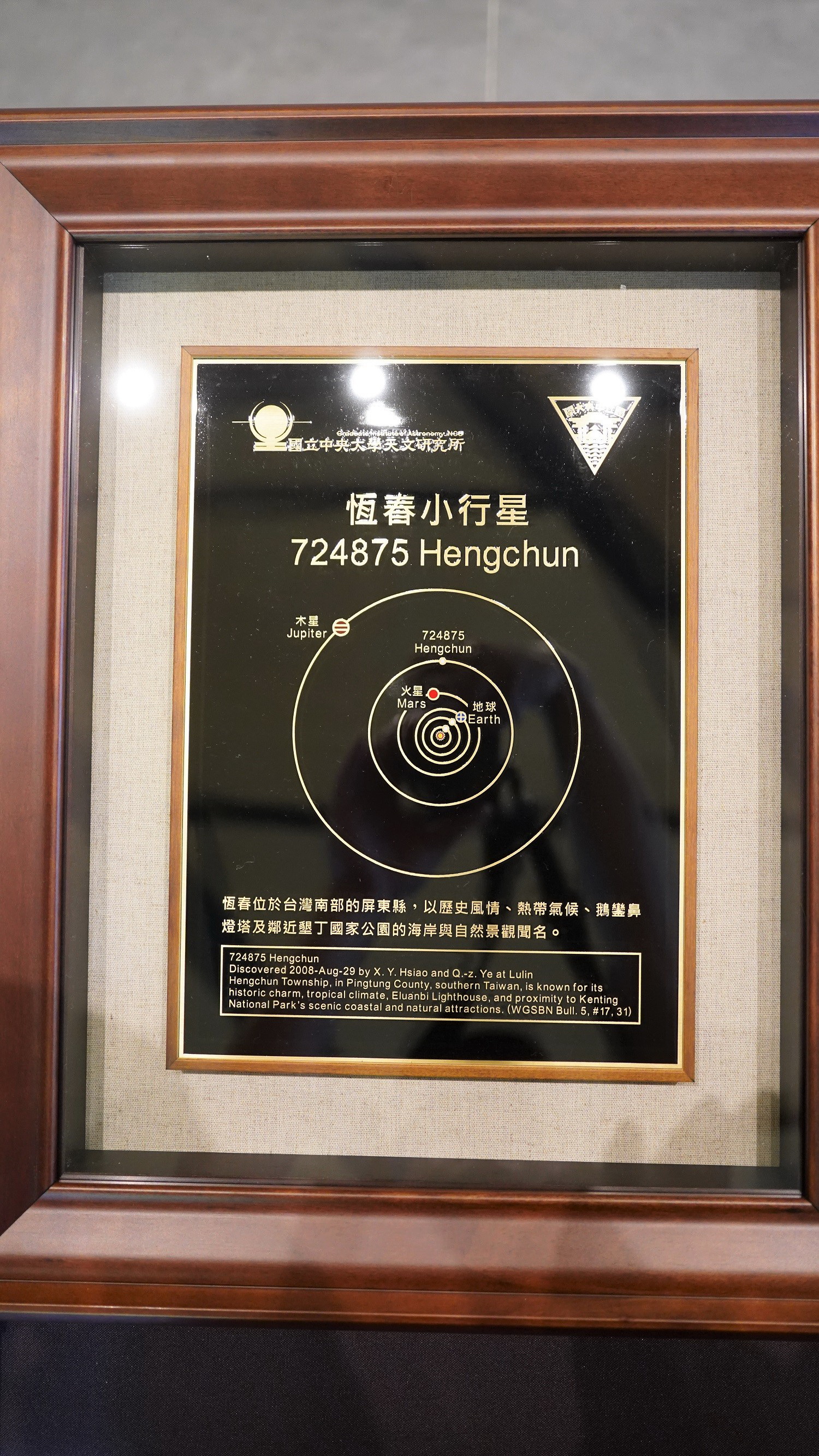 現場由天文團隊代表致贈「HENGCHUN 恆春小行星銘版」,象徵恆春的名字已正式刻入國際星圖。