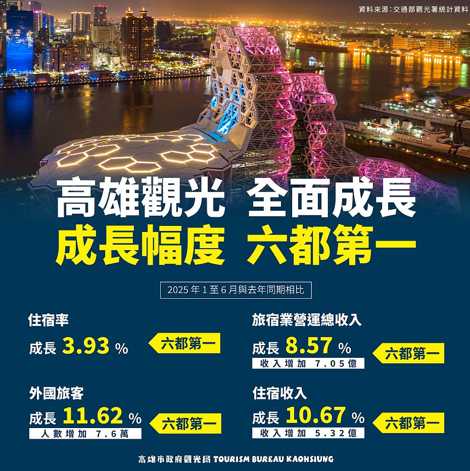 根據交通部觀光署最新統計資料顯示,2025年1至6月高雄市多項觀光指標全面成長。