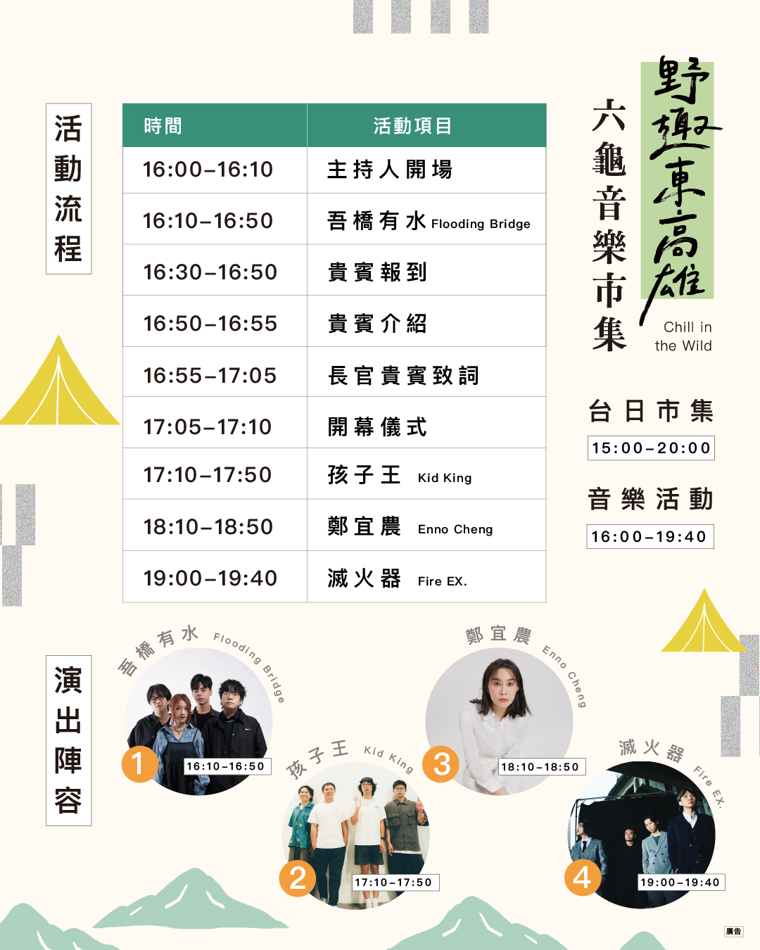 因此特別安排滅火器、鄭宜農、孩子王、吾橋有水等金曲獎重量級卡司輪番開唱。