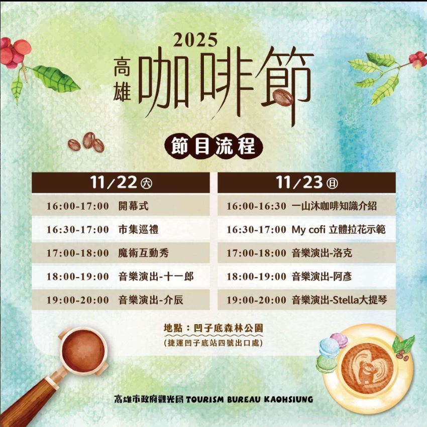 微涼初冬,高雄最「香」的年度盛事即將登場!高雄市政府觀光局宣布,「2025 高雄咖啡節」將於 11 月 22 日、23 日在凹子底公園盛大舉辦。今年以咖啡為主題,結合農業局「神農市集」擴大辦理,吸引超過 140 家特色品牌 共襄盛舉,從咖啡、甜點、手作到質感生活選品,一次滿足咖啡迷與市集愛好者。