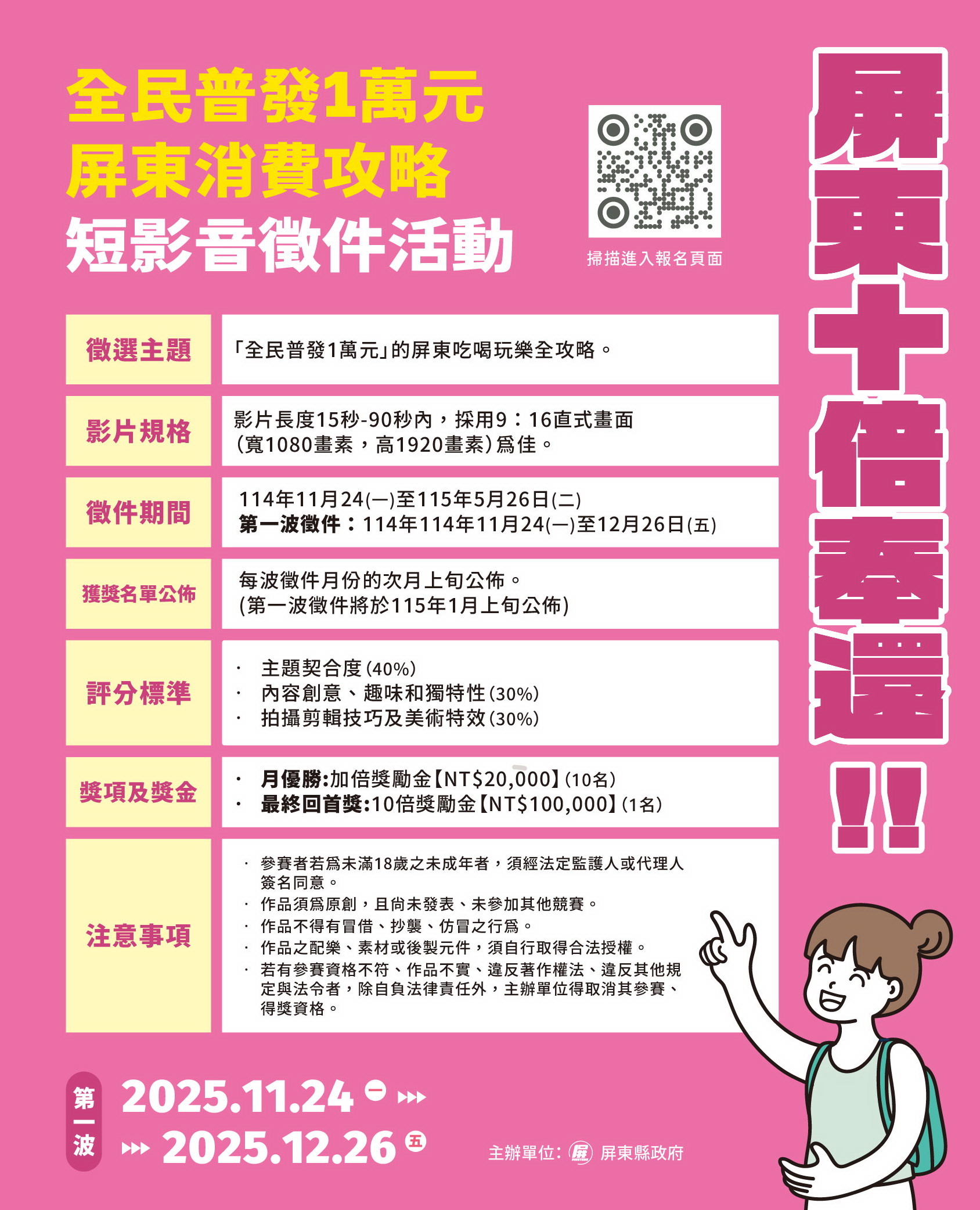 👉 「全民普發1萬元・屏東消費攻略」短影音徵件活動: