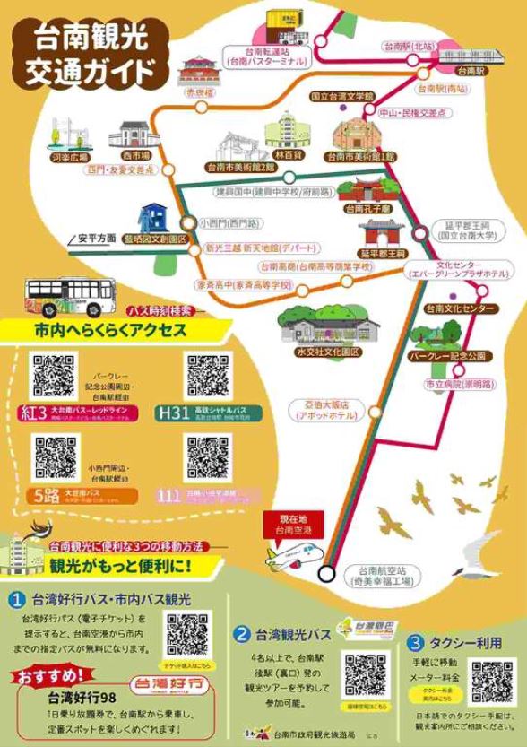 在「接駁用心」部分,觀旅局特別製作交通與旅遊資訊圖卡懶人包,清楚標示公車路線與搭乘方式,協助日本旅客快速進入市區、展開旅程;而在「遊程貼心」方面,精選四條台灣觀巴遊程,只要四人以上預約,即可於臺南火車站後站集合出發,享有專人專車的深度導覽服務,輕鬆體驗臺南魅力。