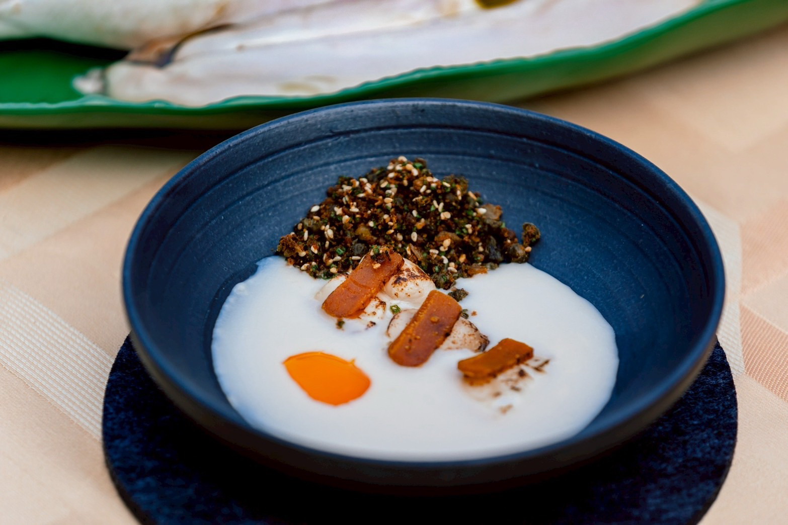 以法式料理手法烹調茄萣在地新鮮食材烏魚鰾與烏魚子,重新詮釋台式鹹豆漿。