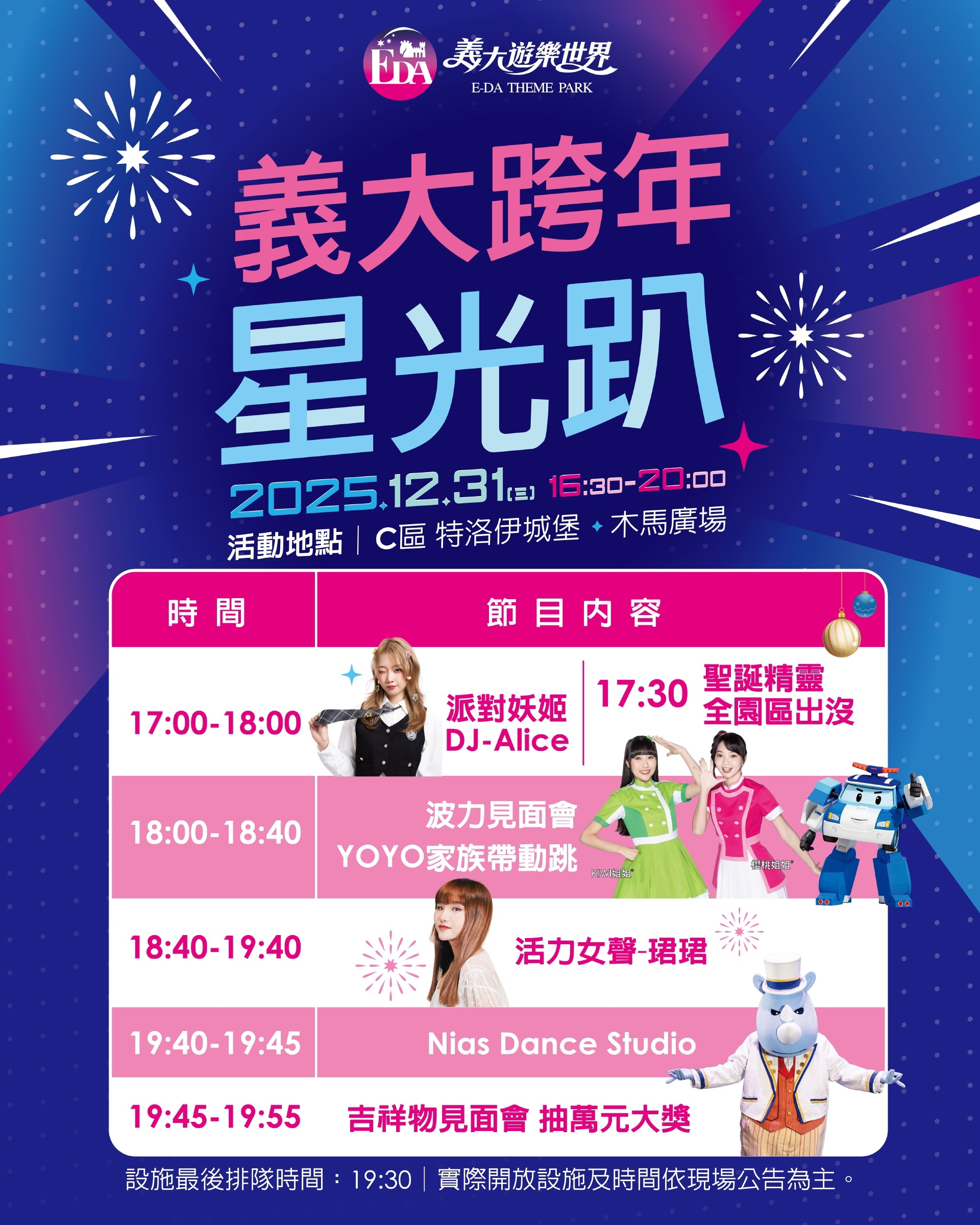 此外,義大遊樂世界16:30-20:00還有「跨年星光趴」,每人350元就可暢玩夜間樂園。