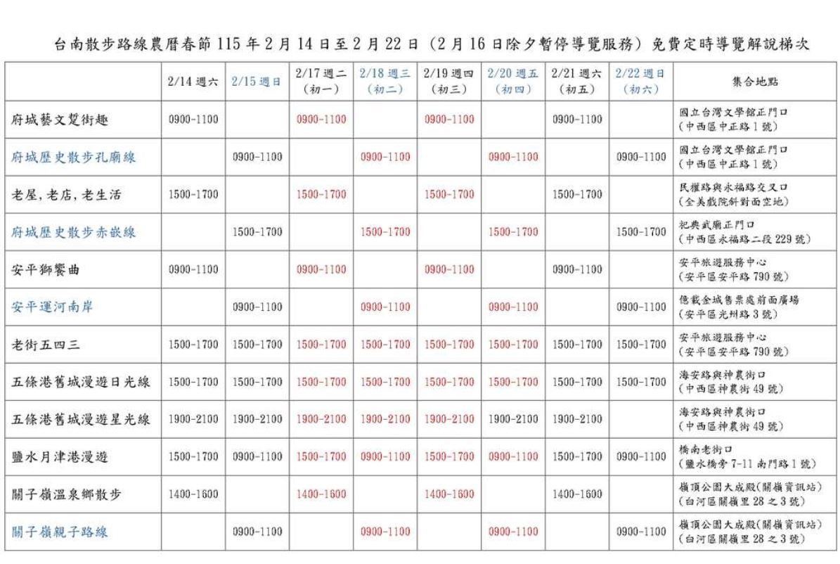 迎接115年農曆春節連續假期,臺南市政府觀光旅遊局推出「台南散步導覽」春節加碼服務,12條免費定時導覽路線自2月14日至2月22日春節期間加開31梯次,連同原有場次共計63梯次,除2月16日除夕當日外,其餘日期皆可報名參加。導覽路線涵蓋中西區、安平區、鹽水區及白河區等觀光熱區,邀請市民與遊客以雙腳走進巷弄,展開一場輕鬆又具深度的城市小旅行。