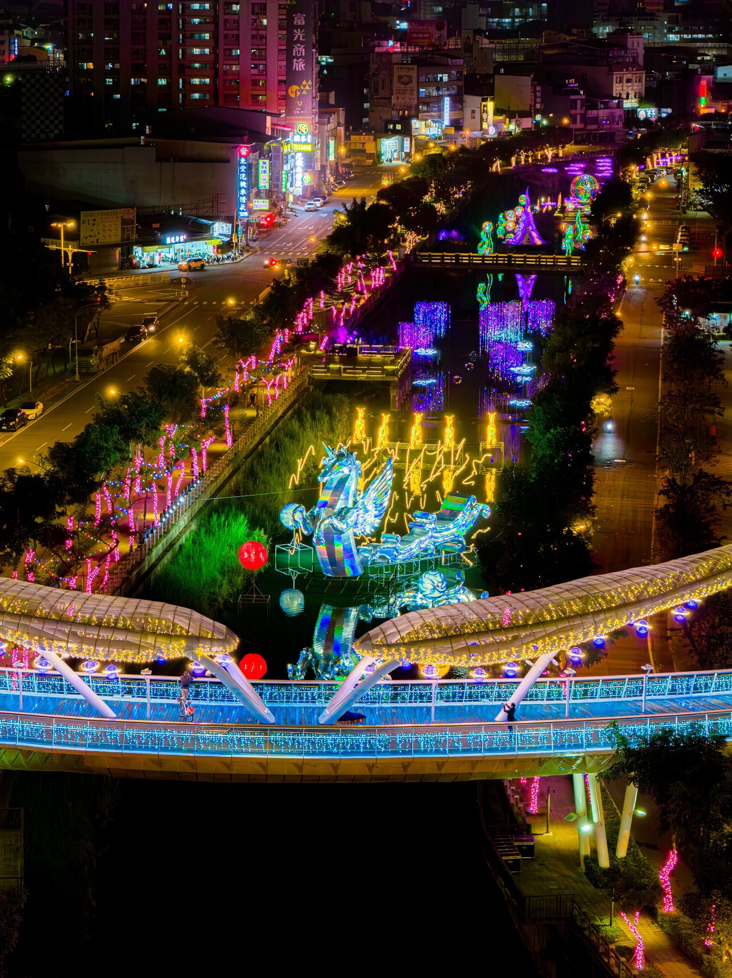 主燈「騰光」呈現駿馬躍出水面的意象,每30分鐘將展演一次燈光秀,為溪畔夜景增添動感與節慶氛圍。