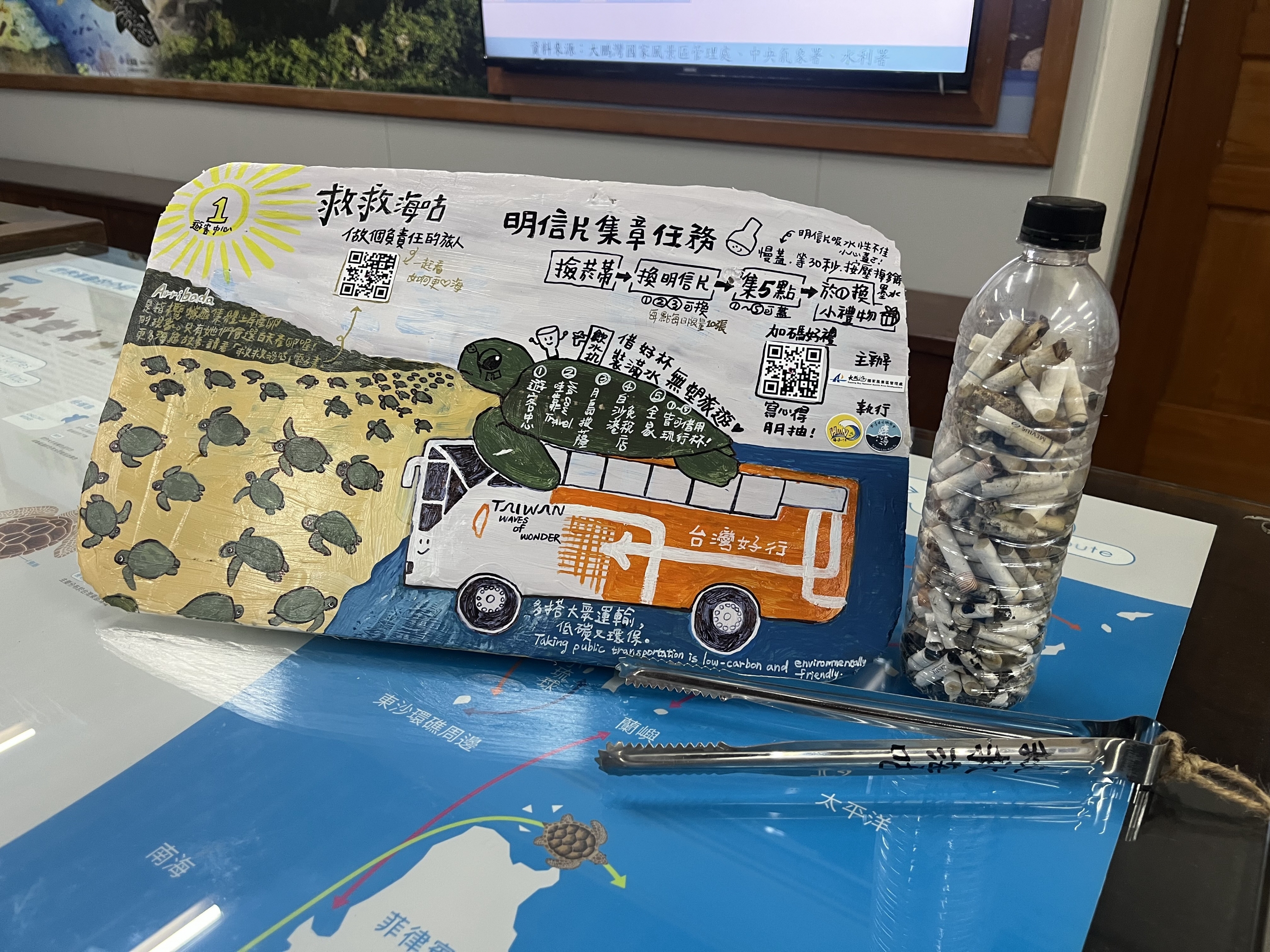 撿滿一瓶煙蒂後,即可兌換一張結合海龜保育知識的教育明信片。