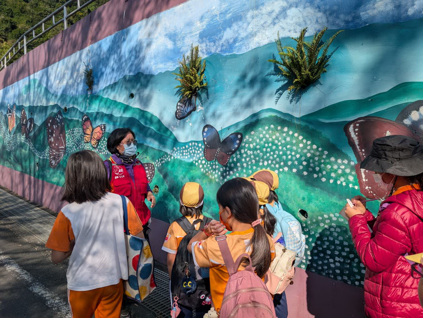 ( 帶領學生藉由牆面圖像介紹紫斑蝶的特性。圖/茂管處提供 )