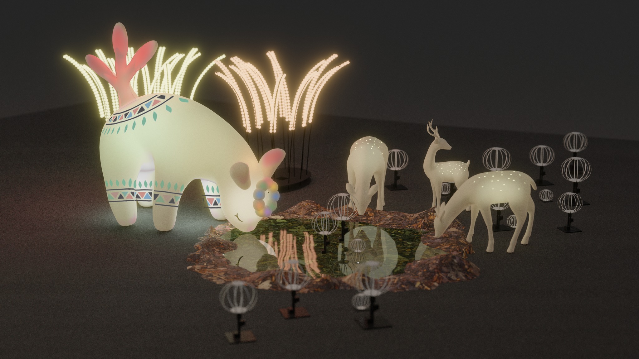 燈區中,梅花鹿延伸為八種各具象徵意涵的「靈鹿」,分佈於山徑與林間。