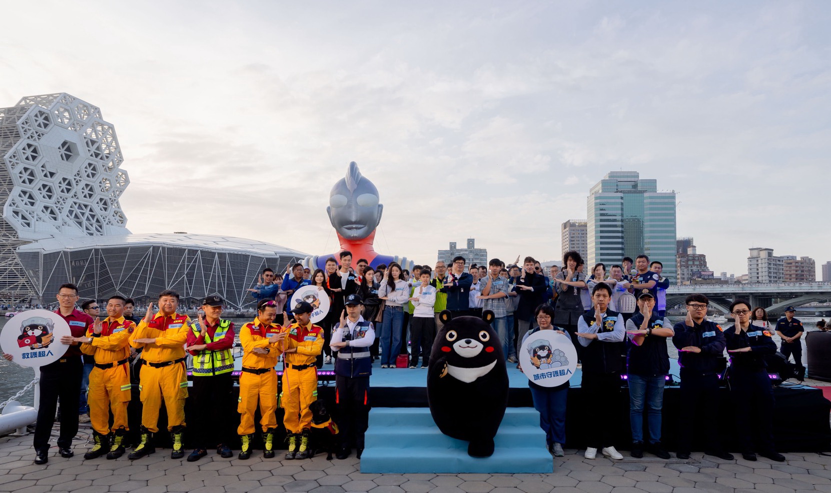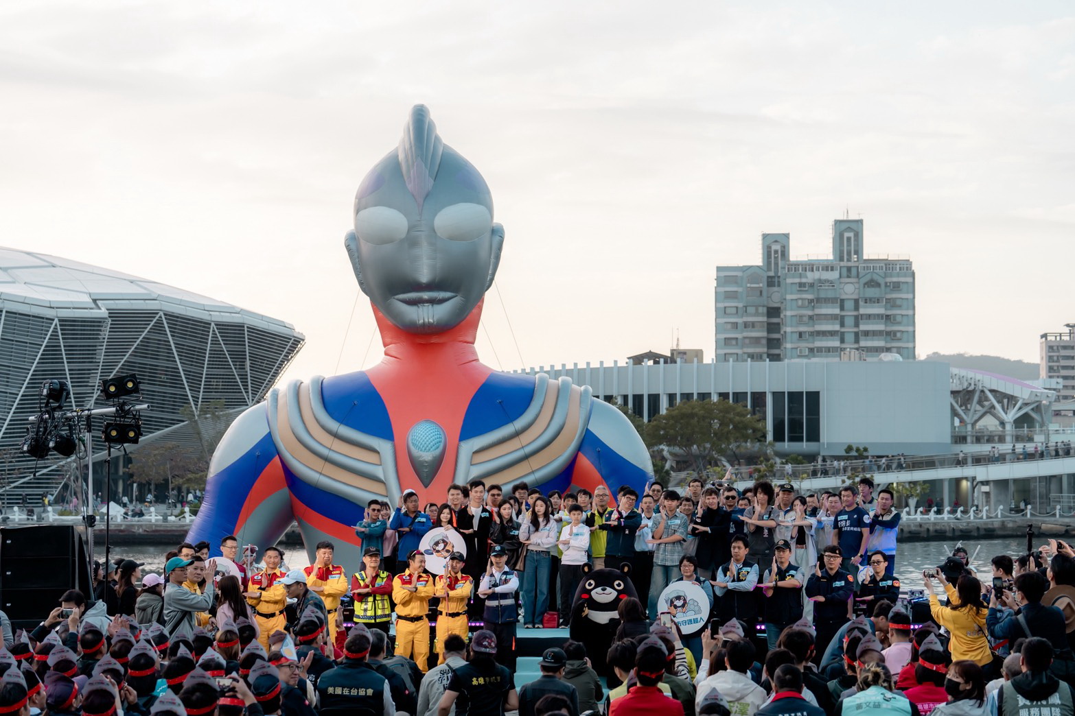 兩座高達15公尺、巨大的超人力霸王在愛河灣水域帥氣現身,市府更邀請70名默默付出的鏟子超人。