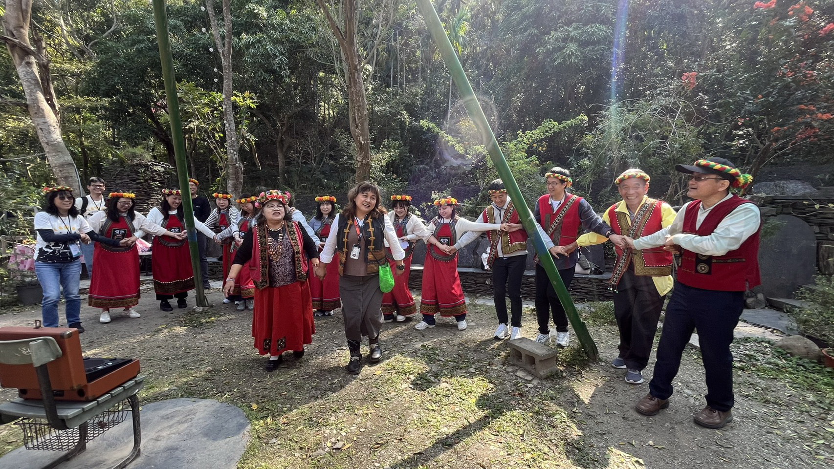 ( 茂管處陳俊綺秘書(右一)與日本JTB旅行社臺灣分公司根本克己社長(右四)等貴賓一同體驗魯凱族傳統圍舞 圖/茂管處提供 )