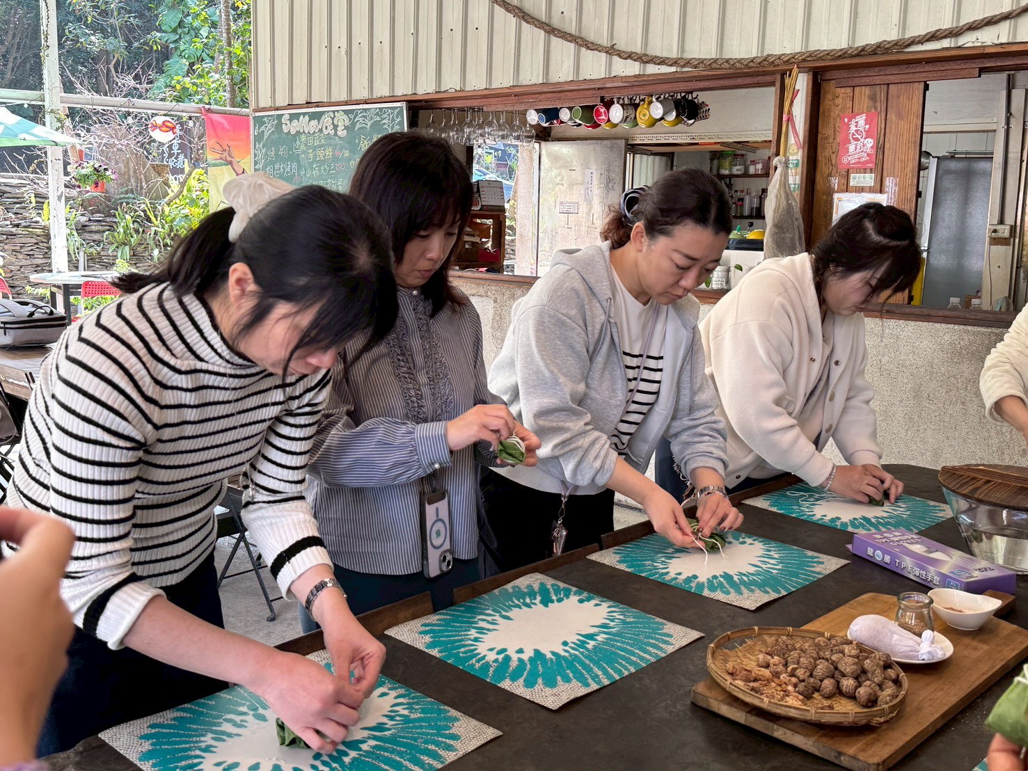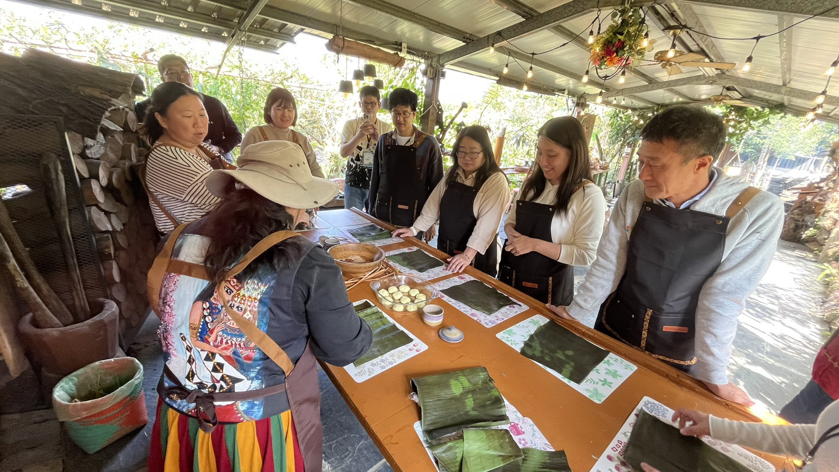 在Sama食堂,貴賓親手製作以甲酸漿葉包裹芋頭乾粉與豬絞肉的魯凱族傳統美食「吉拿富 (Cinavu)」。
