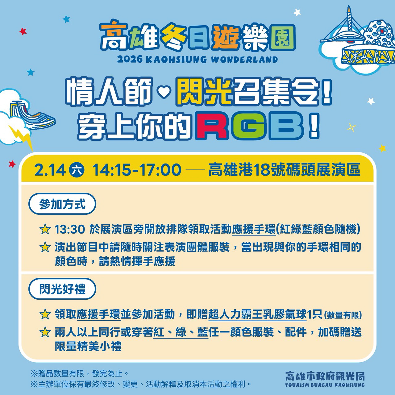 雙人同行或著紅、綠、藍任一顏色服裝、配件的民眾,可再獲得情人節加碼小禮,數量有限,贈完為止。